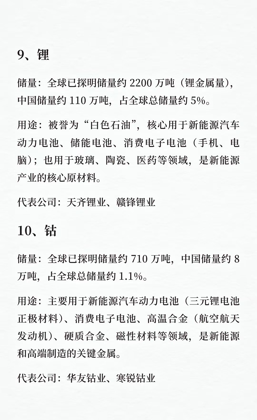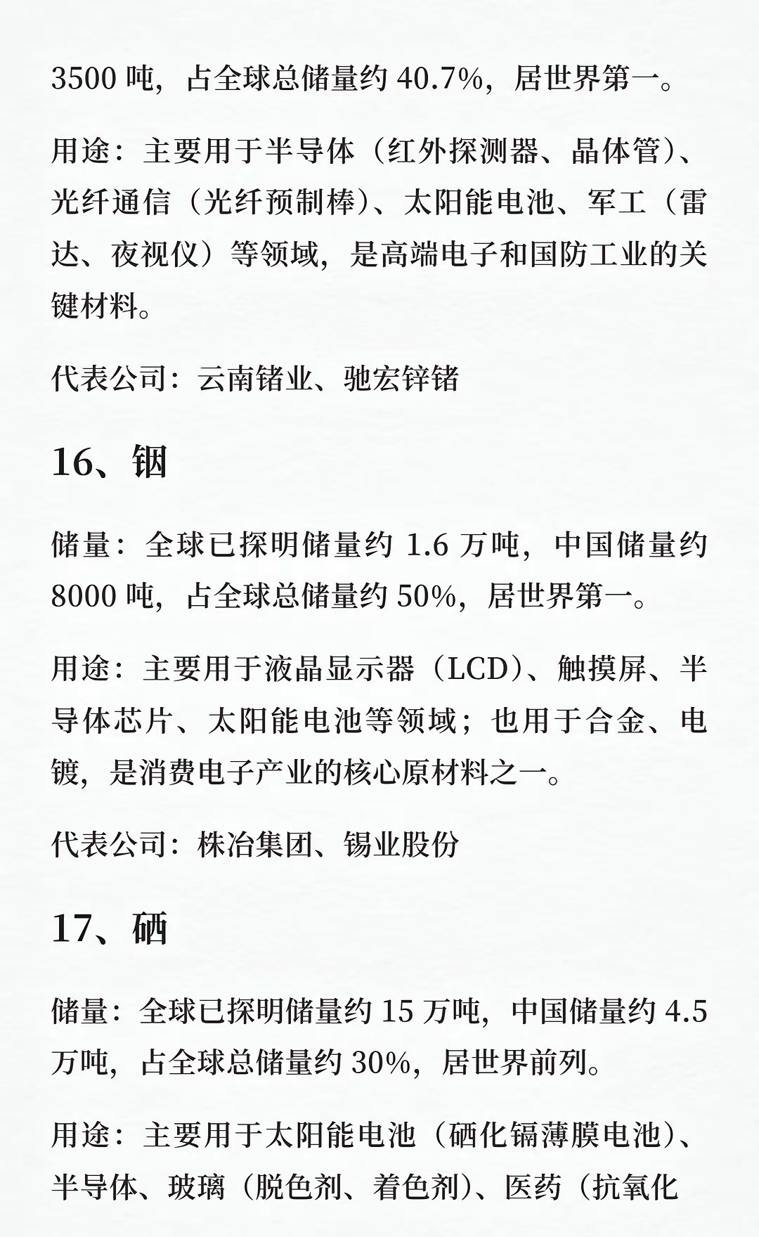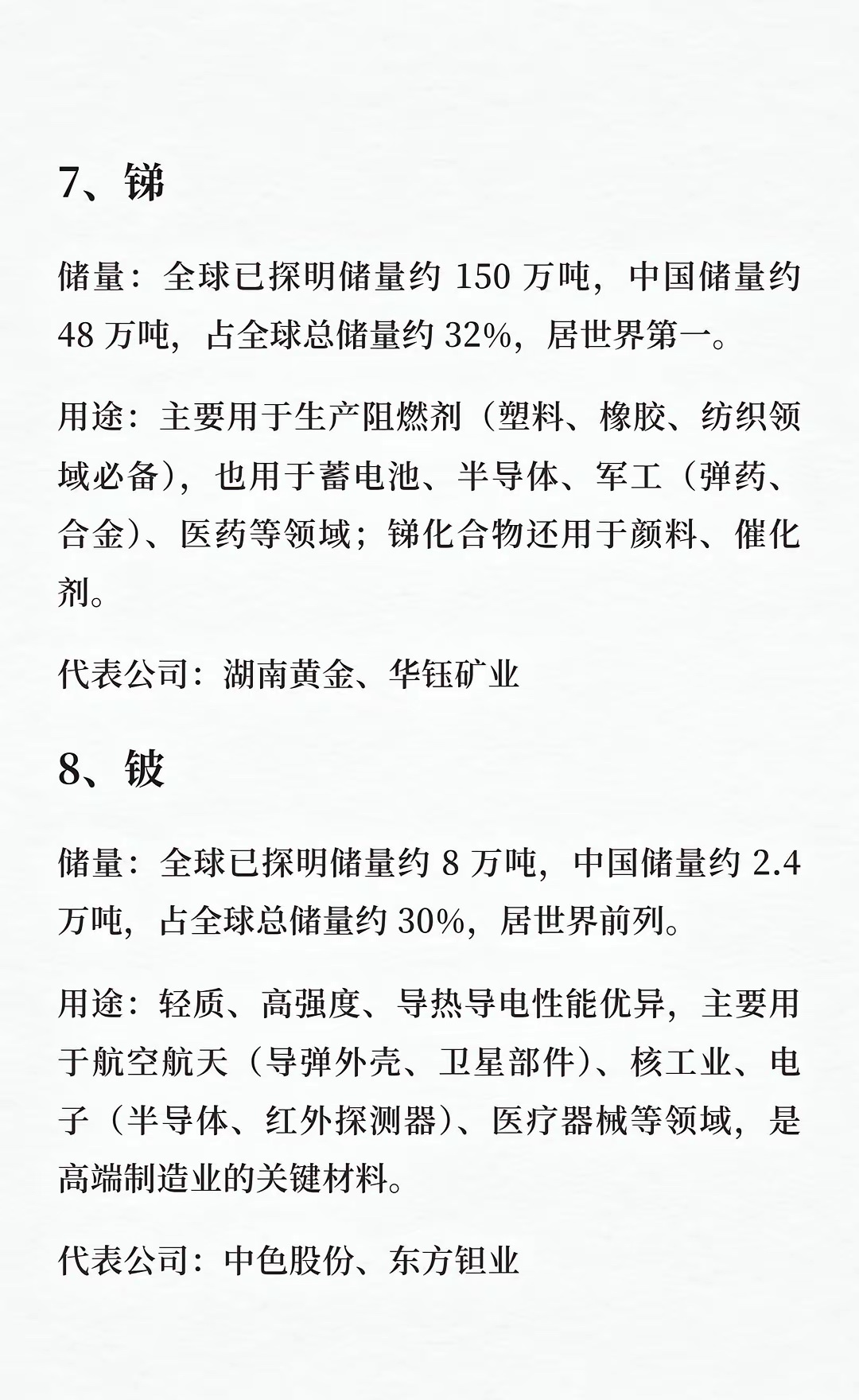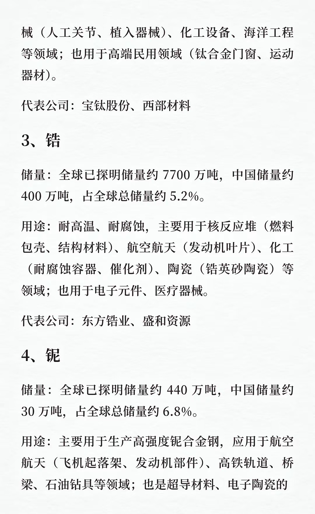 比黄金更稀缺,18种稀有小金属汇总!国际金价历史性突破5600美元,贵金属超级大行情已然打响! 但大家要清楚:稀缺决定价值,需求决定涨幅。 越是不可再生、越是无可替代的资源,爆发力就越强! 接下来我就为大家盘点18种稀有小金属——它们均为工业制造、新能源、航空航天、半导体等高端领域的核心原材料,稀缺性远超黄金,随着高端制造业持续发展,供需缺口或将不断扩大!1、钒储量:全球已探明储量约 2200 万吨,中国储量约 950 万吨,占全球总储量约 43%,居世界第一。用途:主要用于生产高强度、高韧性的钒合金钢,广泛应用于高铁、桥梁、输油管线等基建领域;也是钒电池的核心材料,在储能领域需求快速增长。代表公司:钒钛股份、河钢股份2、钛储量:全球已探明储量约 8.2 亿吨,中国储量约 2.2 亿吨,占全球总储量约 26.8%,居世界前列。用途:具有轻质、高强度、耐腐蚀等特性,广泛应用于航空航天(飞机机身、发动机部件)、医疗器械(人工关节、植入器械)、化工设备、海洋工程等领域;也用于高端民用领域(钛合金门窗、运动器材)。代表公司:宝钛股份、西部材料点个关注,下一篇更精彩!【本文由投资顾问李世雄 执业编号:A0600621030009编辑整理,内容仅代表个人观点,不表明对相关产品服务的风险和收益做出实质性判断或保证,您须独立作出投资决策,风险自担。】