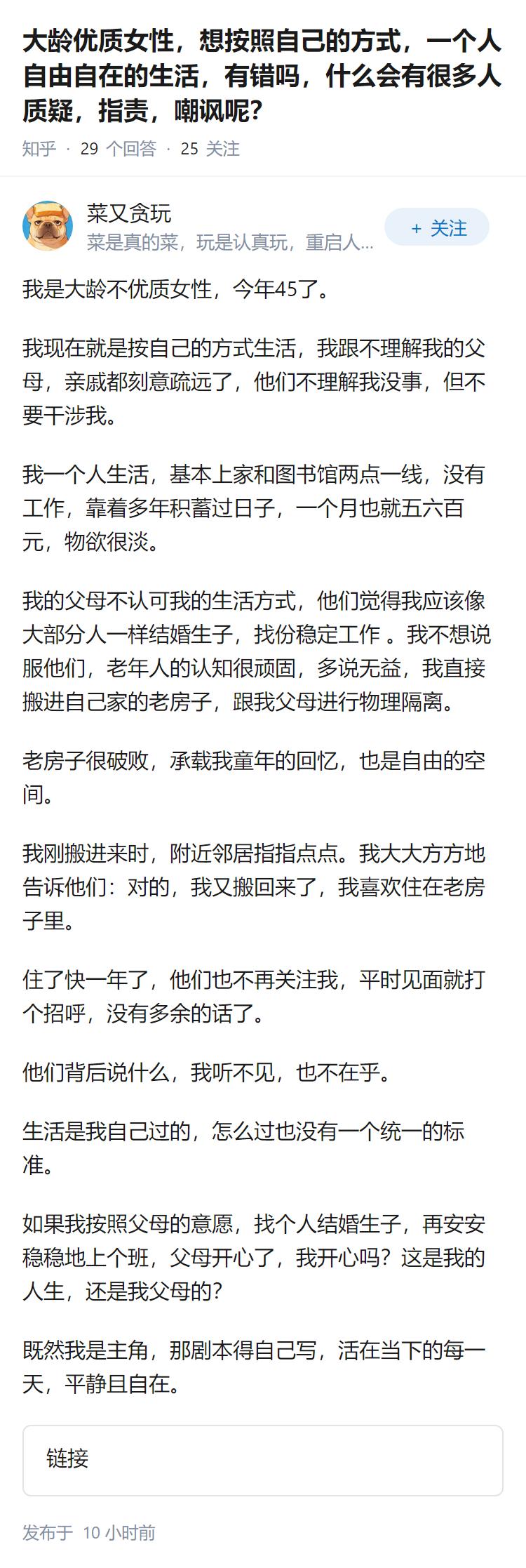 大龄优质女性,想按照自己的方式,一个人自由自在的生活,有错吗,什么会有很多人质疑,指责,嘲讽呢?