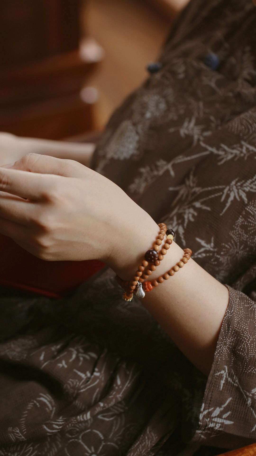老山质润,香韵甜美。配上南红蜜蜡等,非常别致。佩戴在手上,雅致别丽。 老山檀香原创【妙仪】5mm88颗