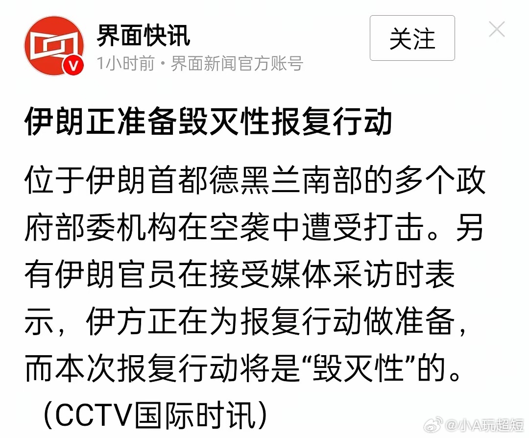 以色列这次搞不好要被导弹洗地,军工产业链崩溃了。在以色列发起了对伊朗袭击之后,伊朗马上向以色列发射了数十枚导弹进行报复。随后,伊朗声称要对以色列进行毁灭性报复行动。而伊朗能够动用的所谓毁灭性报复行动,最大的可能性就是伊朗数千枚导弹加上数量庞大的无人机攻击。去年伊以战争中,以色列夸口的铁穹最终变成了铁筛子。如果伊朗真的破釜沉舟,数千枚导弹加上庞大的无人机超饱和攻击。以色列将变成一片焦土。如果美军配合以色列发起进攻,那么很可能它的航母将变成靶子。即使是它在中东地区的军事基地也大概率会迎来超饱和打击。那么决定这场战争的最终因素就不是什么武器的先进性了,而是导弹与无人机的供应链。刚刚经历了大粪门的美军航母,还能够有那个自信去打一场飞弹持久战吗?伊朗以色列状况伊朗发击以色列