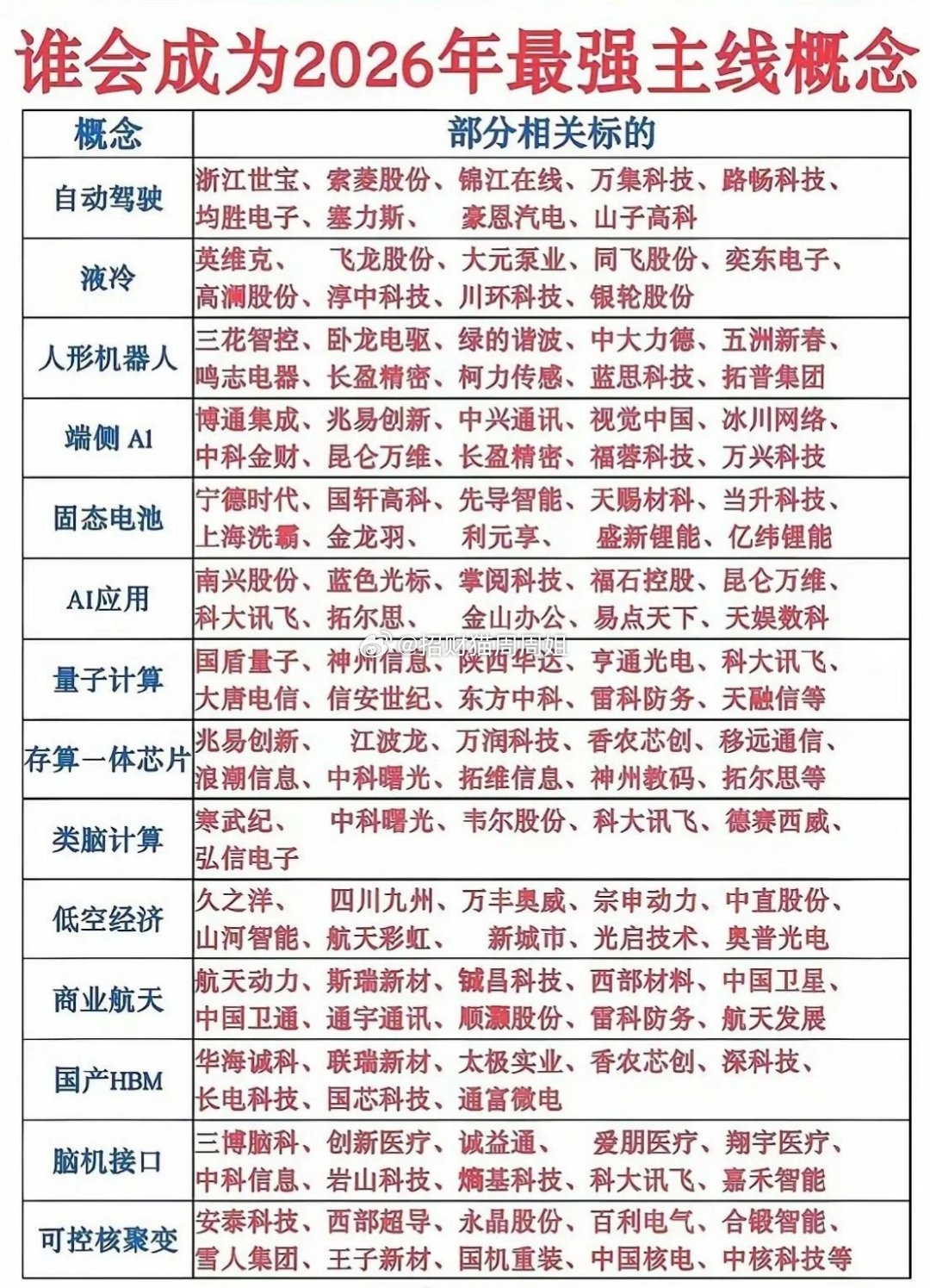 2026年投资市场主线清晰,有不少机遇。商业航天发展迅猛,像航天发展、雷科防务等企业,在航天技术研发等环节布局深。随着全球航天商业化加快,我国相关企业竞争力提升,技术突破和业务拓展会带来发展机会。脑机接口是前沿科技“香饽饽”,岩山科技、三博脑科走在前列。它在医疗、智能交互、娱乐领域潜力大,技术成熟和政策支持下,成长空间可观。存储芯片领域,圣晖集成、兆易创新有优势。全球对其需求旺盛,我国芯片自主可控也在推进。还有黄金,是确定性强的赛道,全球央行购金等因素支撑金价。有优质资源、成本控制好的企业更有竞争力。抓住这些主线,或许能抓住投资机遇。