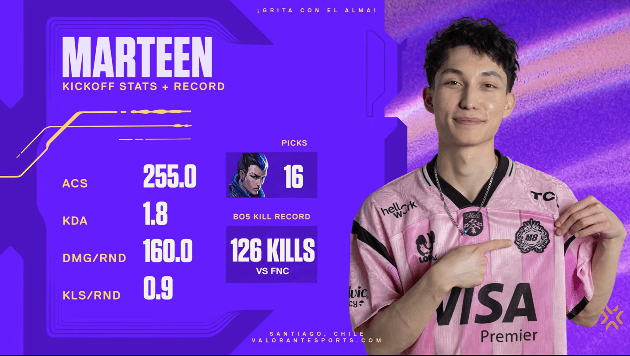 marteen:ACS255、KDA1.8、每回合均伤160、每回合均杀0.9,曾在对阵FNC比赛中拿下126的击杀记录。