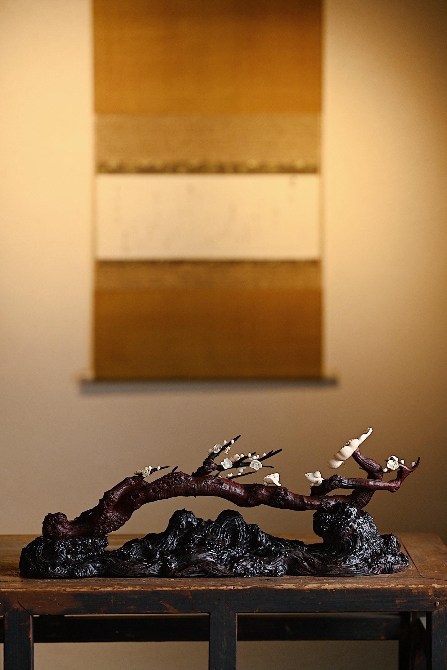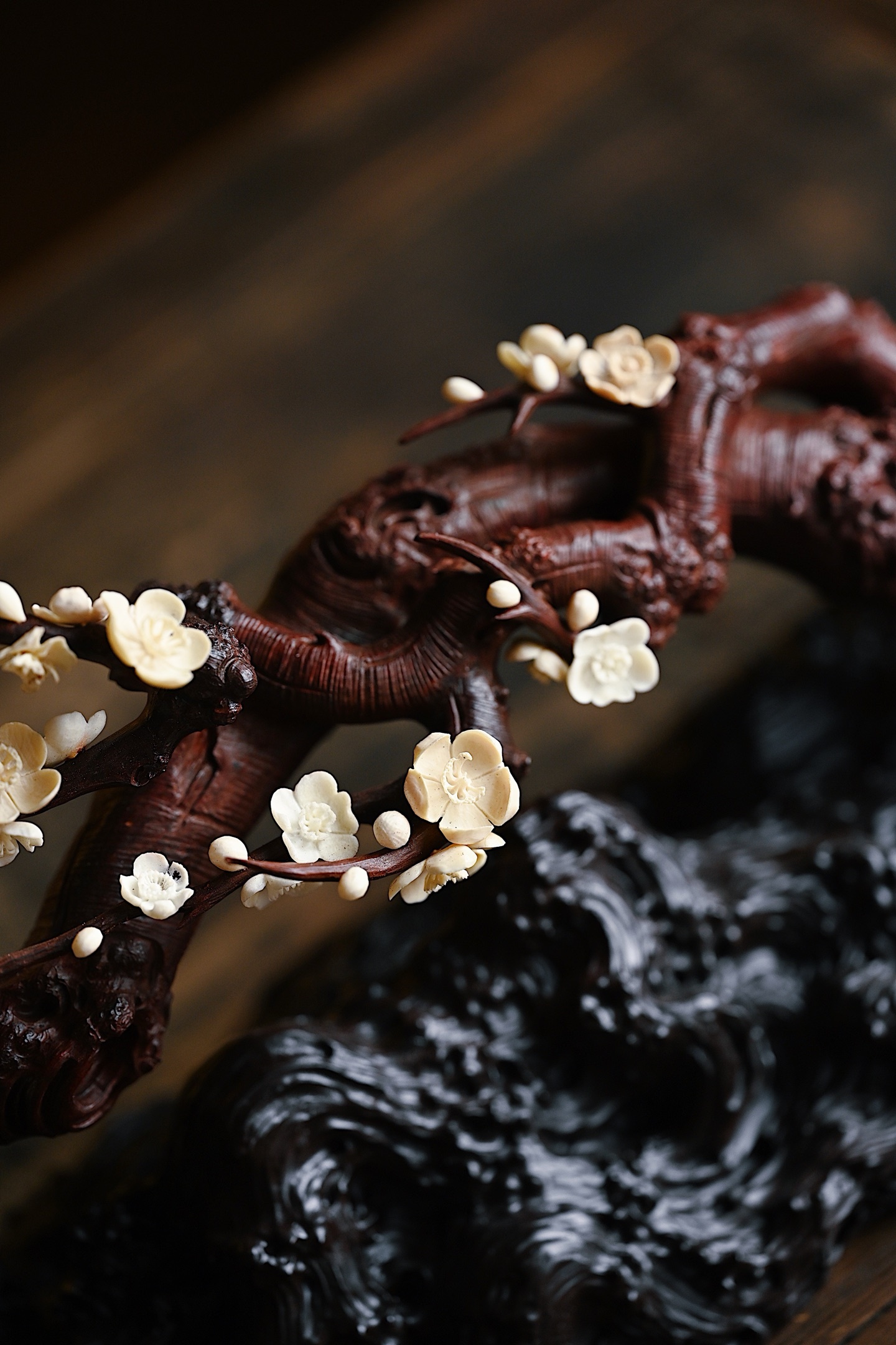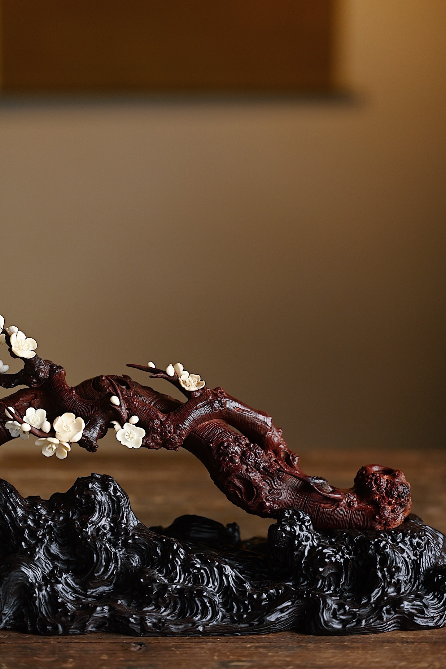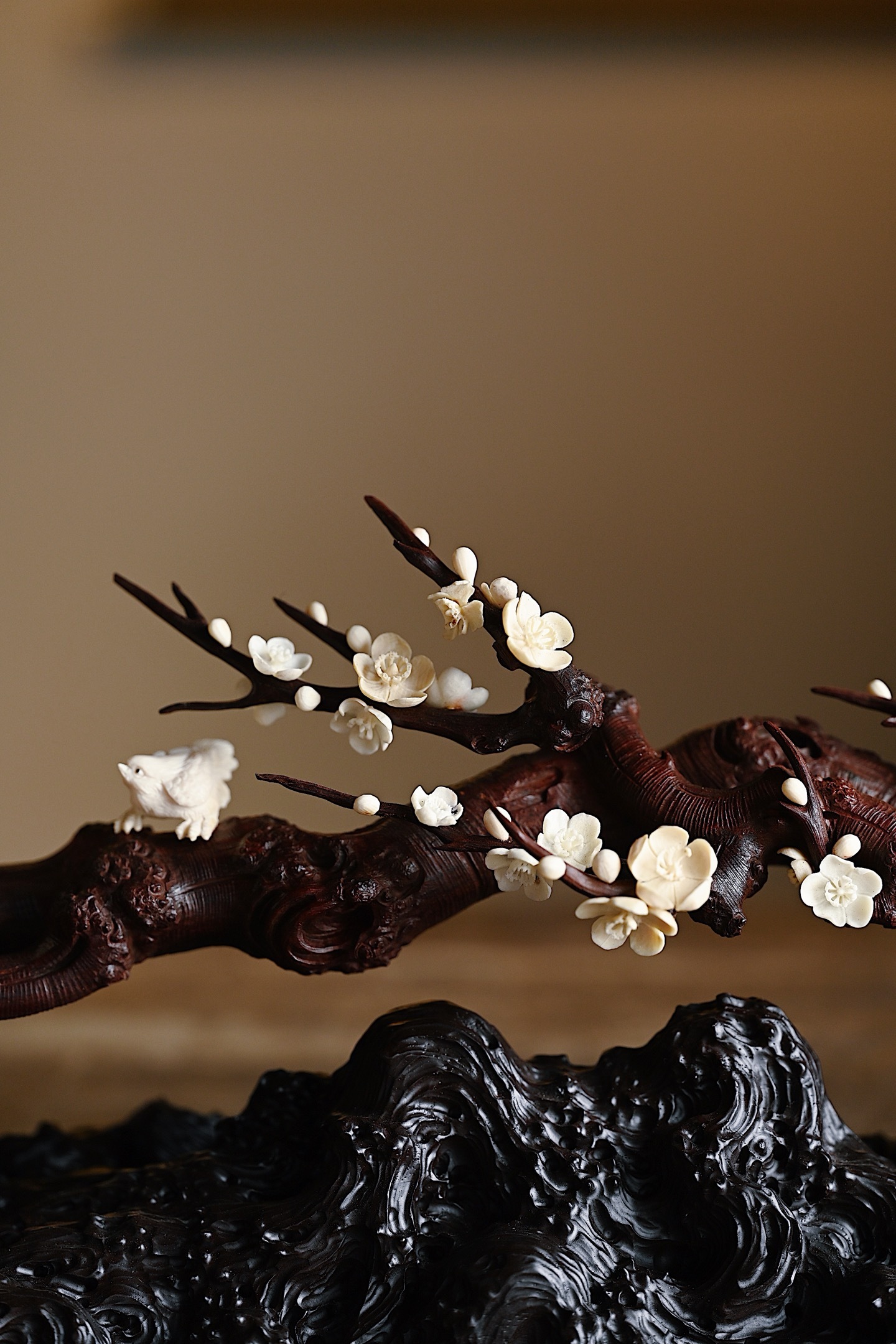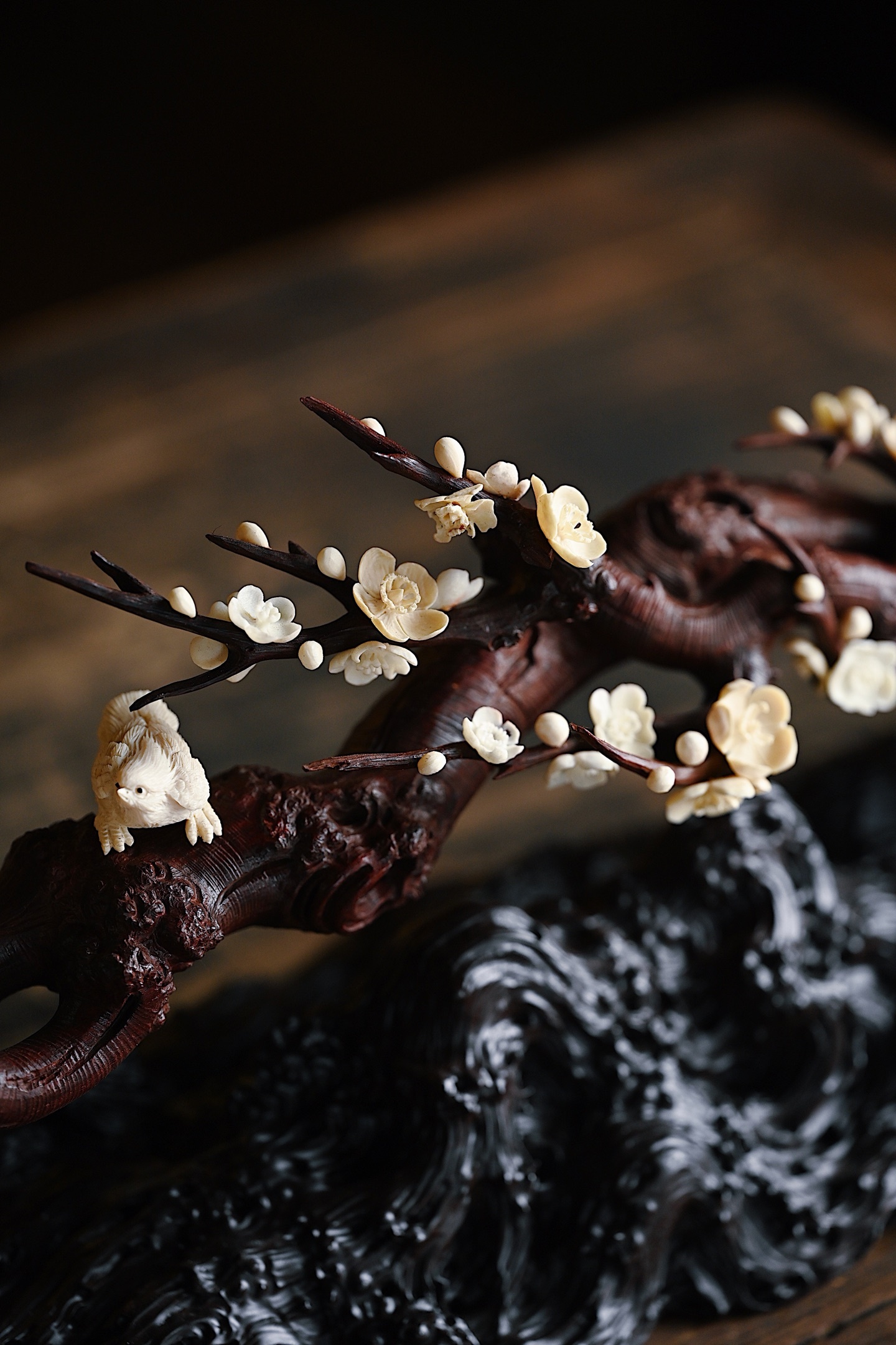 紫檀x猛犸 | 喜上眉梢 如意摆件料色清雅,梅开斗艳,老枝虬曲,雀鸟停驻花枝,婉