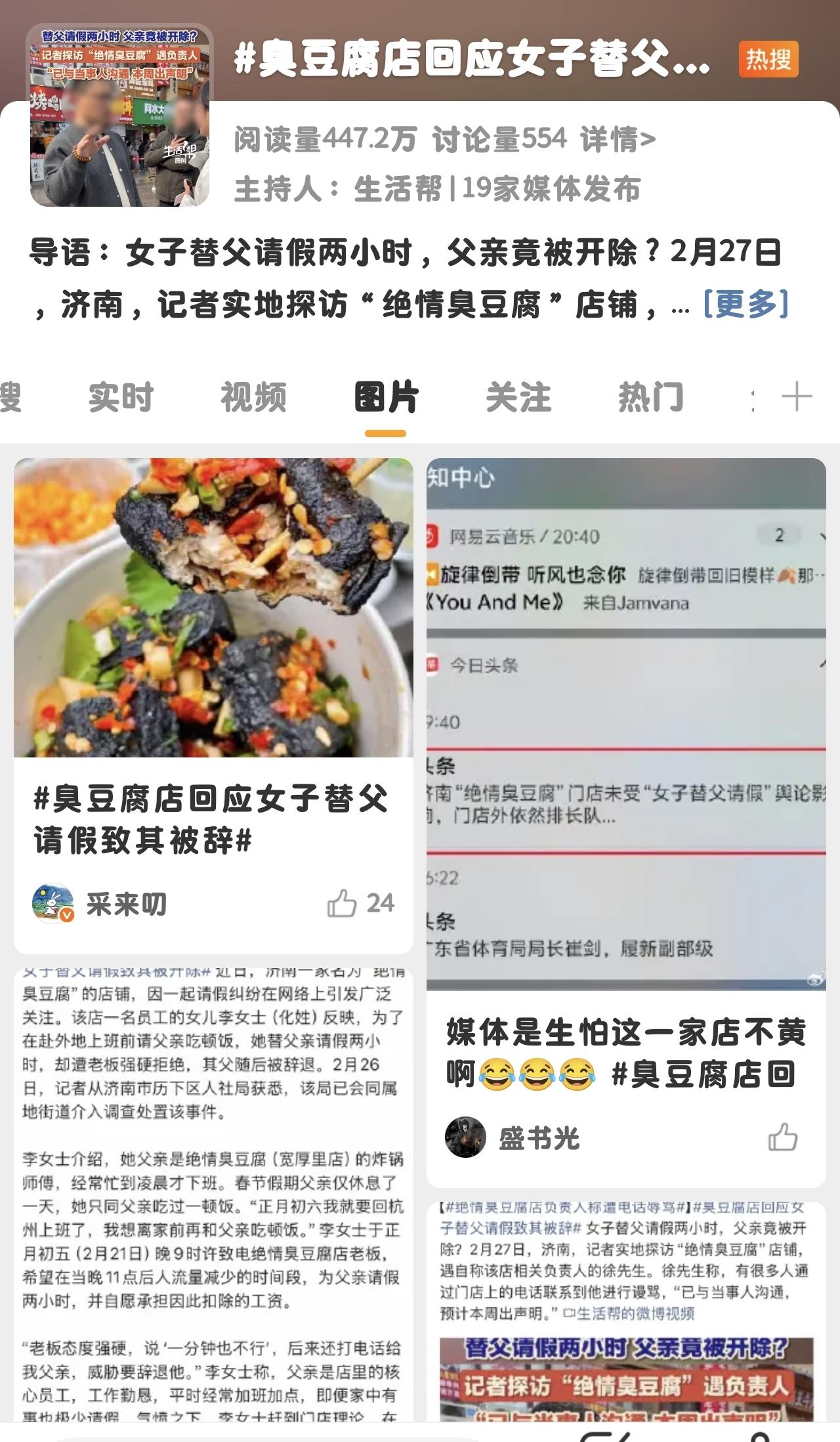 【替父请假两小时父亲竟被开除 媒体评论:绝情臭豆腐何以如此绝情[话筒]】官方回应女子替父请假2小时被开除 近日,济南一家名为“绝情臭豆腐”的店铺,因一起请假纠纷在网络上引发广泛关注。该店一名员工的女儿李女士(化姓)反映,为了在赴外地上班前请父亲吃顿饭,她替父亲请假两小时,却遭老板强硬拒绝,其父随后被辞退。 2月26日,浪潮新闻记者从济南市历下区人社局获悉,该局已会同属地街道介入调查处置该事件。 据李女士介绍,她的父亲是店里的核心员工,工作勤恳,平时经常加班加点,春节假期都只休息了一天。她不过是在大年初五当天,赶在去外地上班前,帮父亲请两个小时假,请他吃一顿饭,这是多么朴素又微小的心愿啊,却被老板一句冷冰冰的“一分钟也不行”挡回来,最后还导致父亲丢了工作。如果她所述属实,那店家的做法真是如其店名一样“绝情”透顶。 这位老父亲是无数城市基层劳动者的缩影,他们用自己的辛劳和付出,支撑起城市的热闹与繁华,却常常连最基本的尊重和关怀都得不到。当一个女儿在店门口控诉老板“太绝情”时,这家豆腐店不仅是招牌上写着“绝情”,骨子里也透着冷漠。 面对舆论质疑和记者追问,商家先是给出“都是不实信息”的模糊辩解,又扔下一句硬邦邦的“关你什么事”,更显得毫无章法,十分心虚。如果认为李女士所述不实,就应该拿住依据,指出其不实之处,光矢口否认换不来公众信任。要知道,千千万万的打工人,最关心的就是如何保护自身权益和尊严,任何对劳动者权益的损害和漠视,不但关媒体记者的事,也关乎我们所有人的事。 小吃店、大排档这类街头美食,之所以能吸引食客,打动人心,靠的不光是味道,更是藏在热气腾腾里的温情与包容。小生意也要有大格局,严管理不等于冷心肠。合法用工是底线,善待员工是根本。做餐饮本就辛苦,员工起早贪黑,不辞劳苦,换来了店铺的生意红火,管理者为何不能多一点体谅,少一些严苛,多一点关怀,少一分傲慢? “最爱发钱的老板”崔培军,企业新春开工首日订单超4亿元。以关怀员工赢得美名的胖东来,成为网红中的长红,这些例子都证明:人心才是最好的品牌,善待员工就是善待自己的未来。相反,如果对员工过于苛刻算计,连两小时的亲情相聚都不愿成全,一言不合就随意辞退,那么不但会寒了劳动者的心,也会让顾客感到齿冷。没有一颗暖意融融的心,也做不出人情味满满,能留住回头客的小吃。 如果李女士所述属实,店家仅因一次未批准的短时请假就开除员工,涉嫌违法解除劳动合同,需要支付相应赔偿,如果该员工春节期间加班未获三倍工资,店家也须依法支付加班费。可见,李女士为父亲挺身而出、勇敢维权的行为,虽然方式激烈了些,但仍值得肯定。面对不公正、不合法的现象,我们不能沉默和退让,唯有勇敢维权,主动寻求帮助,劳动者的权益才能得到更周全的保护,劳动环境才能持续规范和优化。 仅仅两小时的假期,善意成全能换来父女难得的相聚,也会让员工对岗位更信任,工作时更努力,但冷酷拒绝,蛮横辞退,只会坏了口碑,失了人心,还会面临监管的“铁拳”,实在是得不偿失的愚蠢行为。这事也给所有经营者提了个醒:守护人心就是守护事业之基,待人刻薄只会自砸招牌,规则冰冷终究人走茶凉。只有善待每一位努力生活的人,才是凝聚人气,生意长红的正道