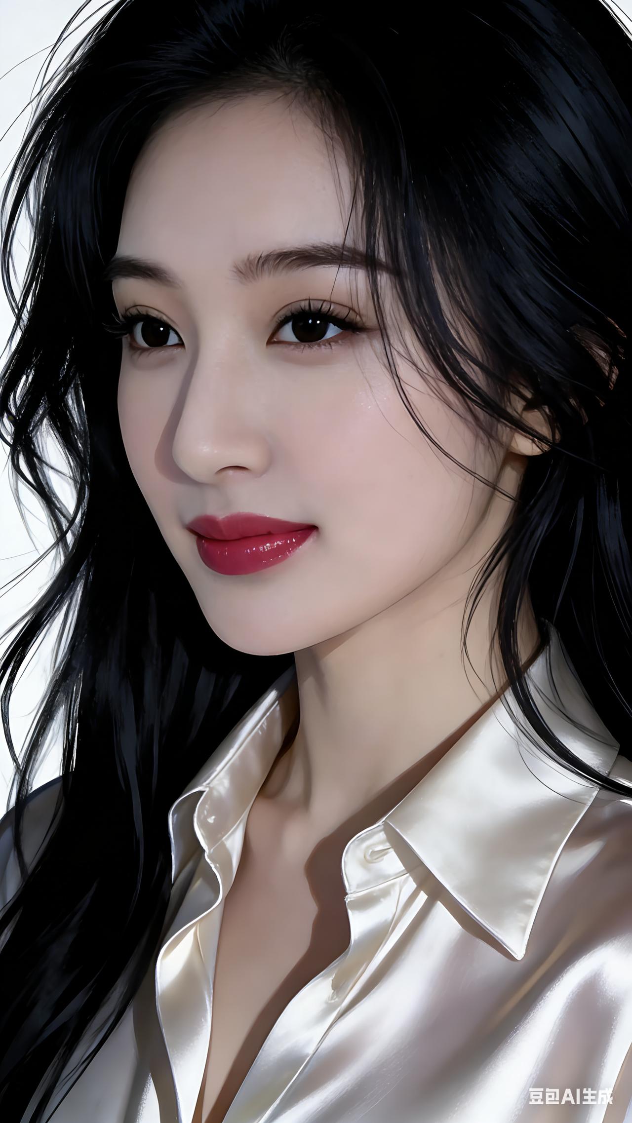 真人写真,黑长垂顺柔亮发丝蓬松飘逸,冷白肌肤水润滑嫩,极致妆容,唇小巧丰盈。真丝
