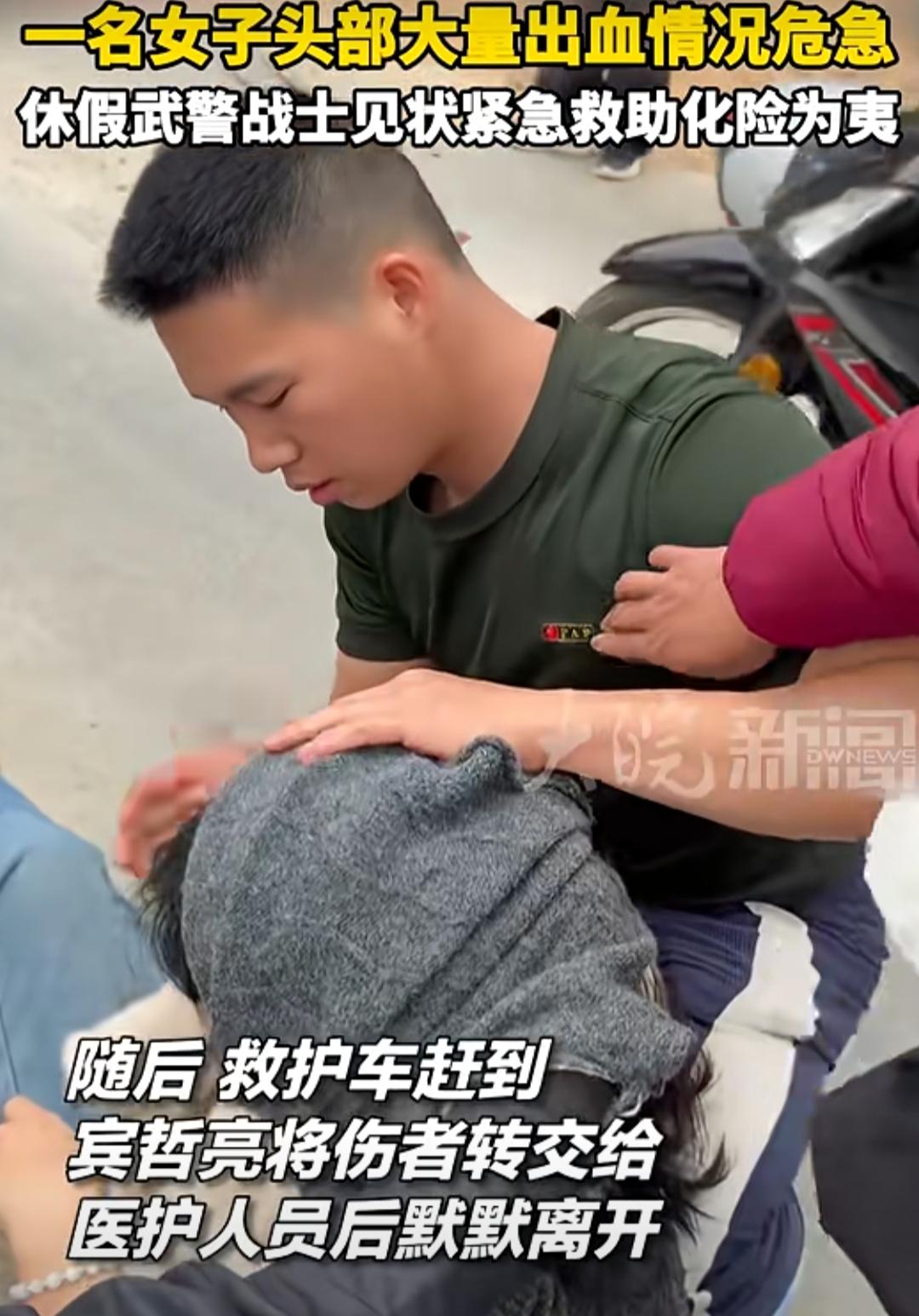 大年初一,本该是万家团圆、走亲访友的日子。广西钦州浦北县的一条乡间公路上,却上演了一场惊心动魄的生死救援。 一名女子骑电动车侧翻,头部重重磕在地上,鲜血瞬间染红了路面,情况万分危急。路过的行人纷纷驻足,却因场面吓人而不敢上前。就在这千钧一发之际,一个穿着便装的年轻身影冲了出来。 他叫宾哲亮,是武警第二机动总队某支队的一名中士,那天正好休假在家。面对满地的鲜血和女子微弱的呻吟,他没有丝毫犹豫。“当时情况特别紧急,地上都是血,我什么也没想就冲上去了。”事后回忆起那一刻,他的语气平静得像在说一件再平常不过的事。 他迅速将伤者转移到安全地带,凭借在部队练就的专业急救技能,有条不紊地进行止血、包扎。冰冷的绷带一圈圈缠上,他的手上、衣服上都沾满了血,却浑然不觉。他一边熟练地操作,一边拨打急救电话,联系伤者家属,直到救护车的鸣笛声由远及近。 当医护人员赶到,他仔细交接完伤者情况后,便默默转身,消失在人群中。没有留下姓名,没有等待感谢,仿佛刚才那惊心动魄的几分钟,只是他休假日常里的一个普通插曲。 后来我们才知道,那名女子出血量极大,再晚几分钟,后果不堪设想。是宾哲亮的果断出手,为生命争取了最宝贵的时间。 有人问他,不怕被讹吗?他只是憨厚地笑了笑:“我是一名军人,救人是本能。” 这抹“橄榄绿”,没有惊天动地的誓言,却用最朴素的行动,诠释了“人民子弟兵”的真正含义。他的背影,是这个春节最温暖的底色;他的选择,是刻在骨子里的担当。 当我们在朋友圈晒着团圆饭时,总有人在默默守护着我们的平安。这,就是中国军人。橄榄绿 乡间公路