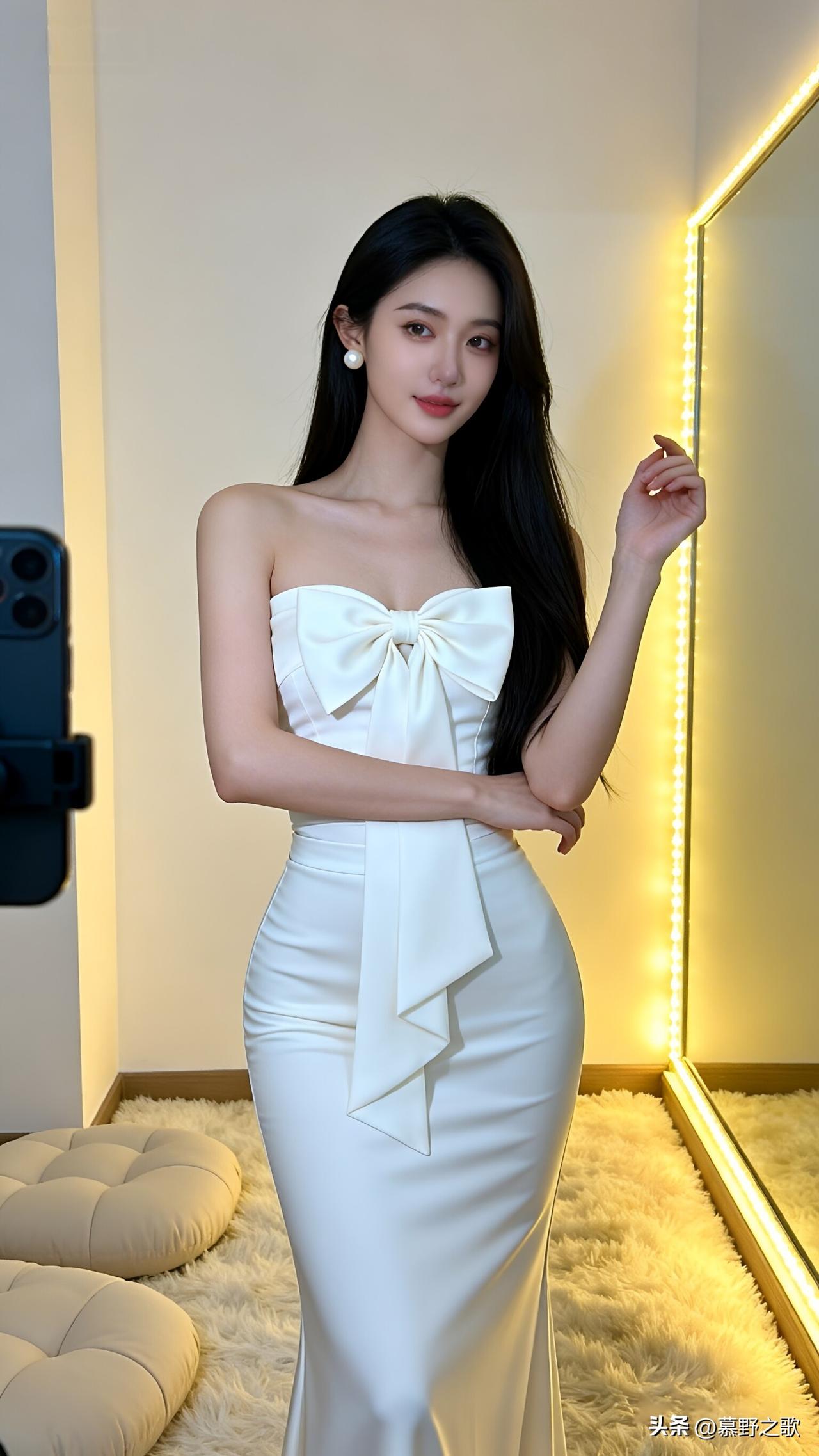 对着手机镜头调整姿势时,抹胸裙上的大蝴蝶结在胸前轻晃,缎面材质泛着柔光,像把月光揉进了衣料。珍珠耳坠在颈侧轻响,和身后的暖光带撞出温柔的光晕。 想起昨天写的爆款文案里,反复提到“仪式感的营造”。此刻站在镜头前才懂,仪式感从不是昂贵的堆砌,而是白裙的纯粹,是蝴蝶结的浪漫,是愿意为自己花时间的认真。今天不赶稿,就做自己镜头里的女主角,把所有美好都定格在帧里。 美女人像群 抹胸连衣裙 自拍姿势 仪式感穿搭