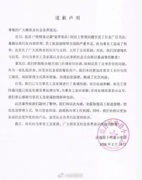“绝情臭豆腐”确实太绝情,仅仅因为女儿替父亲请假2小时,就将勤勤恳恳的老员工辞退,并且放出豪言,一分钱补偿也没有。 还是老话说得好,做人要本分。要不然,曾经有多嚣张,现在就有多狼狈。这不,结果来了。针对此事,28日,“绝情臭豆腐”发布了道歉声明。 面对这份道歉声明,老板当初的那份专横跋扈的劲头哪里去了,当时不是在电话里说出一句狠话,“(请)一分钟(假)都不行”吗?怎么觉悟一下子提升了这么多? 也有网友认为 ,“绝情臭豆腐”之所以发布道歉声明,不是老板觉悟提升,认识到自己错了,而是事件的走向对他十分不利,自己感到害怕了。 你想想看,事件发生后 ,当地人社局已介入调查,律师接手维权,网友声援如潮,再绝情的老板恐怕也招架不住,只得低头 ,为自己的狂妄、鲁莽和无知付出代价。 不过,一纸道歉并不能给这一事件划上句号。有网友建议 ,当地的人社部门应该好好查一下这家店 ,对该店的违法用工行为给予行政处罚,不能讲情面,越绝情越好。