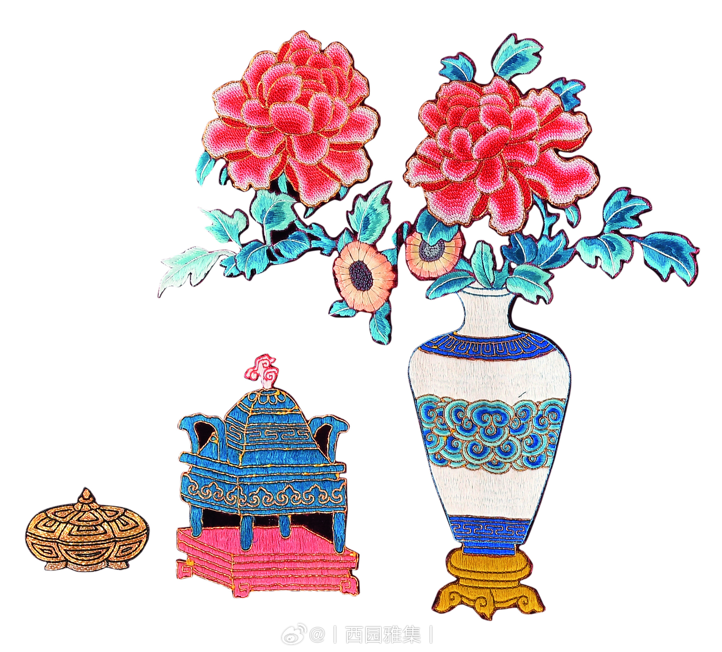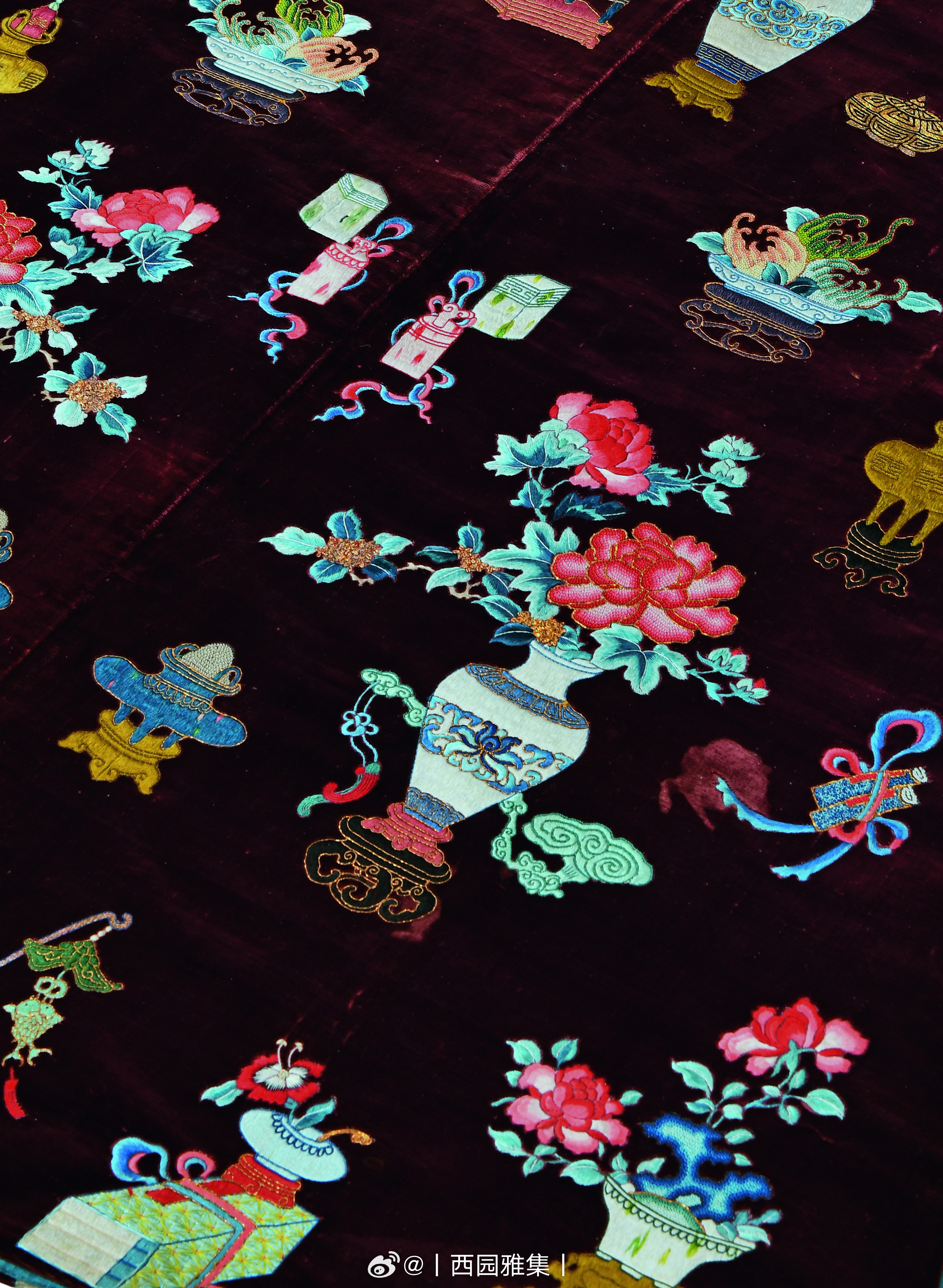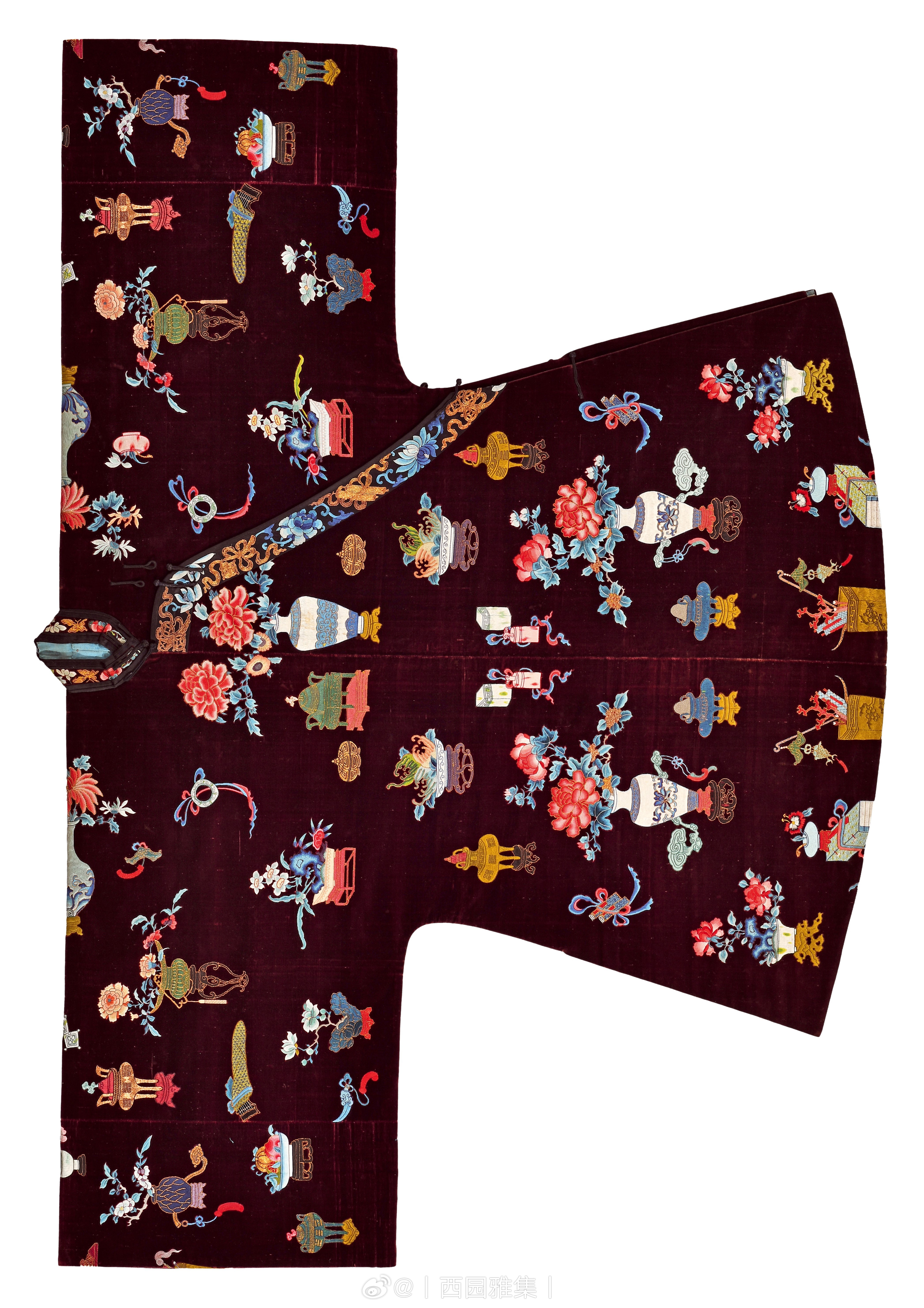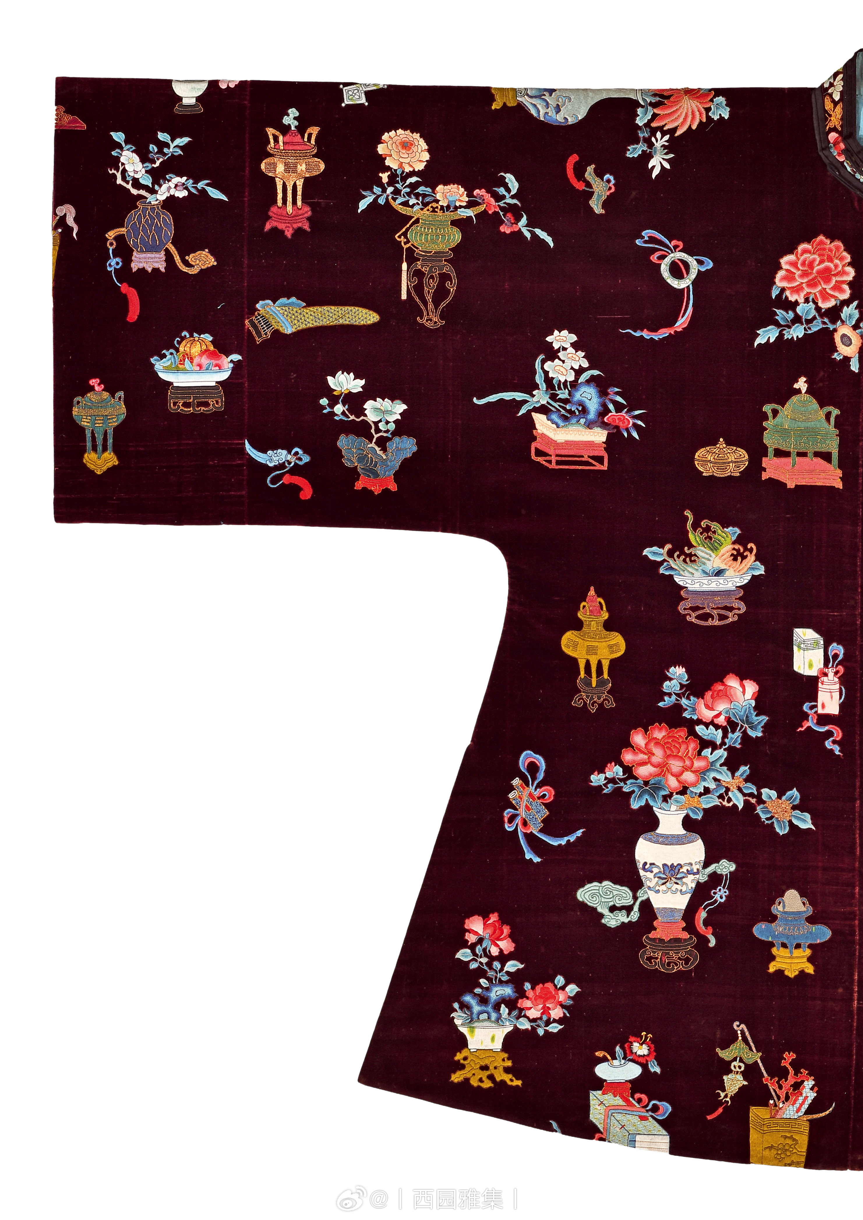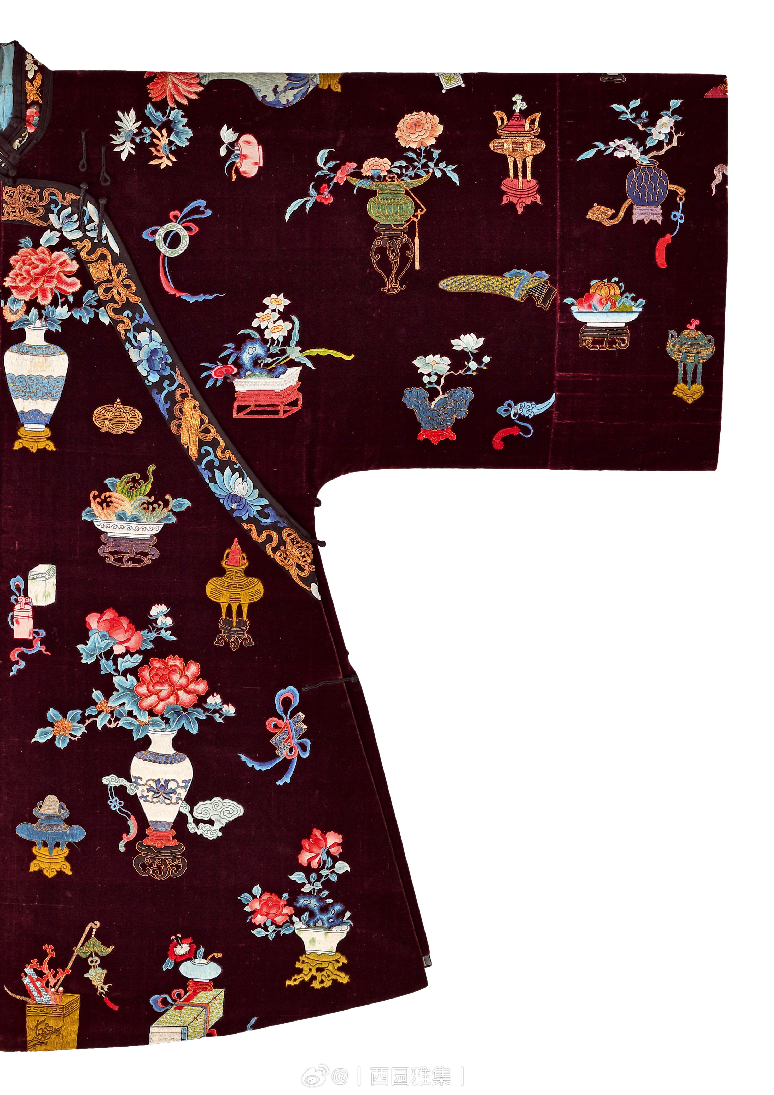 锦绣集 | 清乾隆 绛红地漳绒彩绣清供图女褂