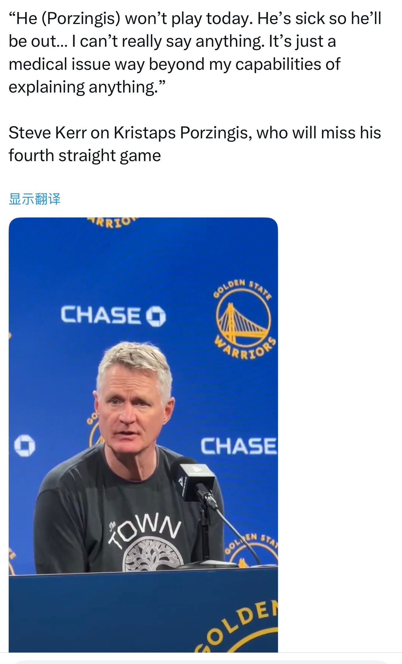 勇士主帅科尔:“波尔津吉斯今日不会出战,他身体不适,因此将继续缺阵。我无法透露更