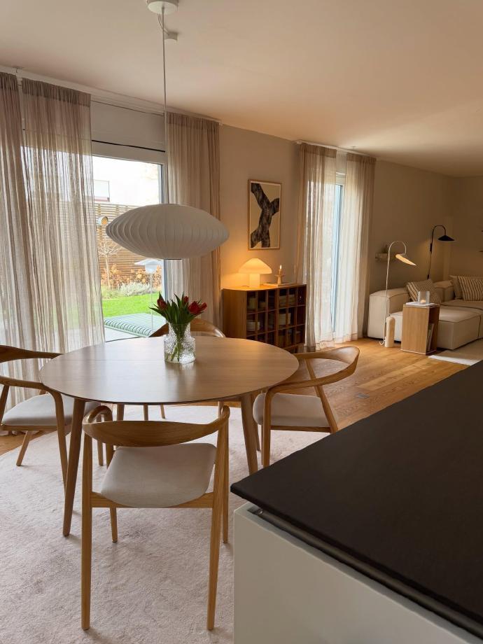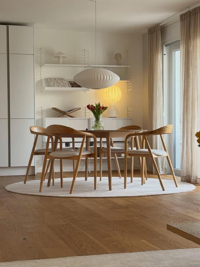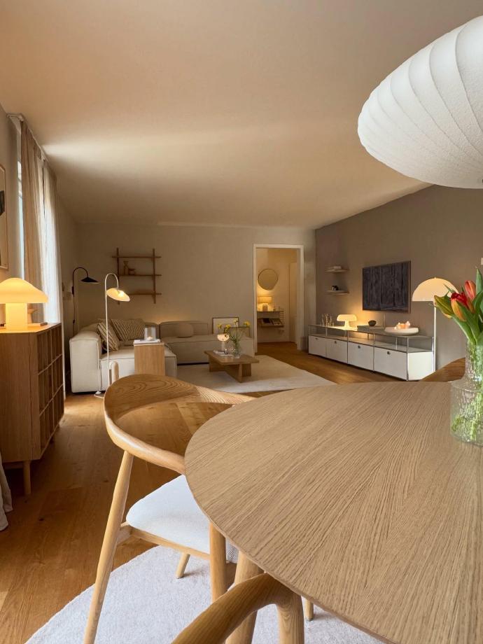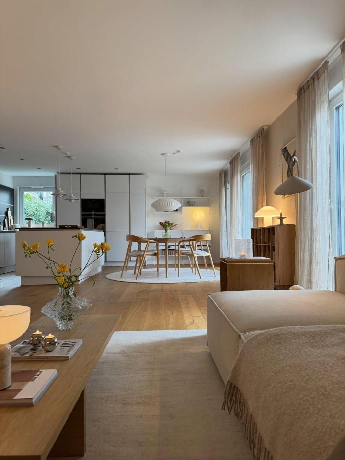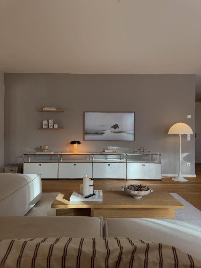 家居设计|日式北欧极简主义以燕麦色与奶油白交织为基底,点缀深色木质与黑色壁灯。