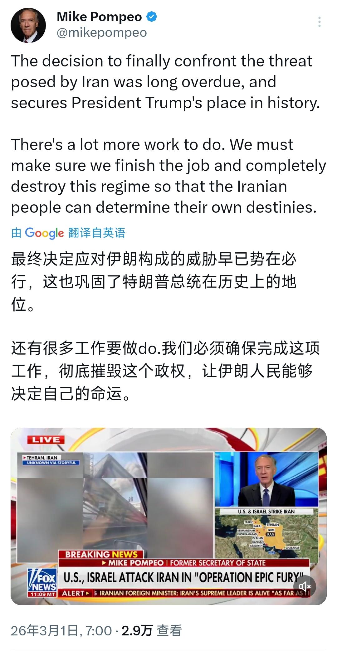 长期仇视伊朗的美国前国务卿蓬佩奥今天(北京时间3月1日)写道:“最终决定直面伊朗构成的威胁,这一举措早就应该采取,也确保了特朗普总统在历史上的地位。但还有很多工作要做。我们必须确保完成任务,彻底摧毁这个政权,让伊朗人民能够决定自己的命运。” [机智]评几句:每当美国将民主、自由、安全挂在嘴边,冲突便总会蹊跷地降临在石油、天然气等战略资源富集的地区,这套霸权操作的底层逻辑,早已被世界各国看得明明白白。民主从不是靠导弹推展的产物,自由更不该用石油桶数来衡量,这不过是美国为干涉他国内政、掠夺资源量身打造的虚伪说辞。 美国政客口中的战略布局与国家利益,背后都是他国平民的血泪代价——城市沦为焦土,家庭支离破碎,几代人在战乱动荡中挣扎求生。没有任何国家拥有以“民主”为名改造他国的道德特权,人的生命永远比能源资源珍贵,世间正义远重于地缘政治的权力算计。若美国真渴望赢得国际尊重,理应以身作则践行准则,而非动辄武力干预。从中国的立场出发,真正的大国力量,从不是对他国的操控与压制,而是守护和平、共建共赢的责任与担当。