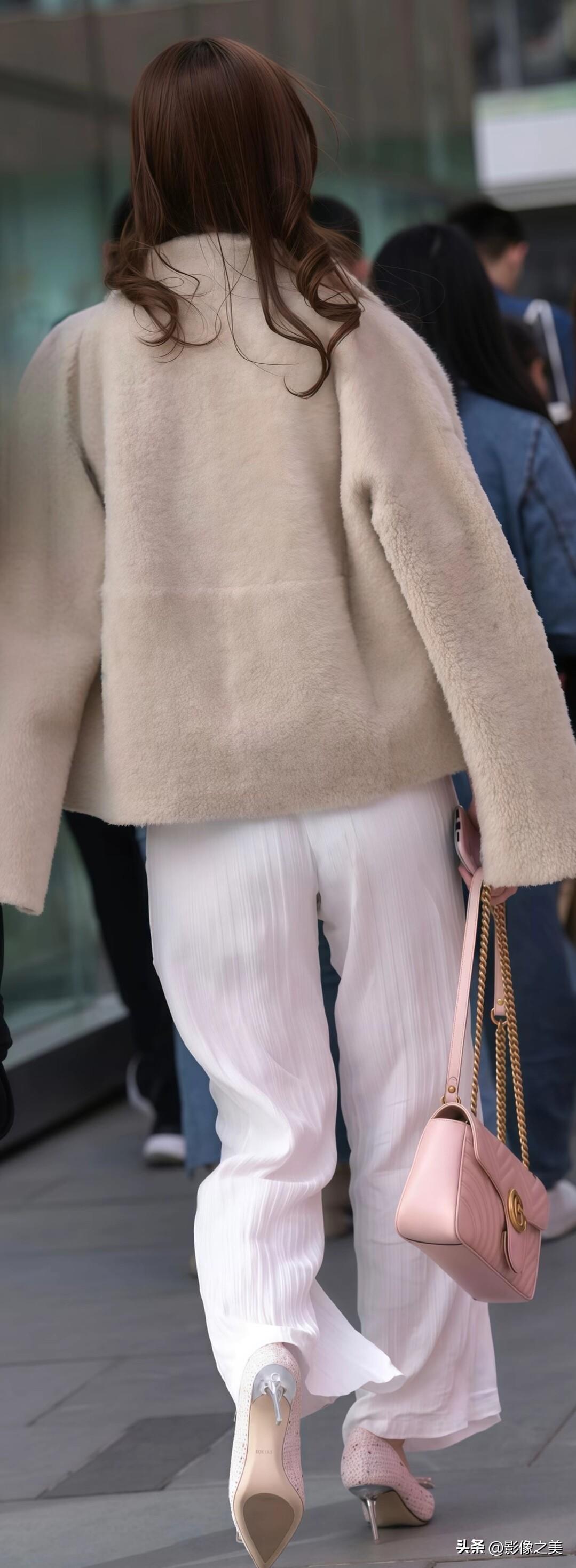 浅杏色短外套搭配柔粉内搭与白色阔腿裤,再配上同色系包包,温柔又显气质,是春日里温