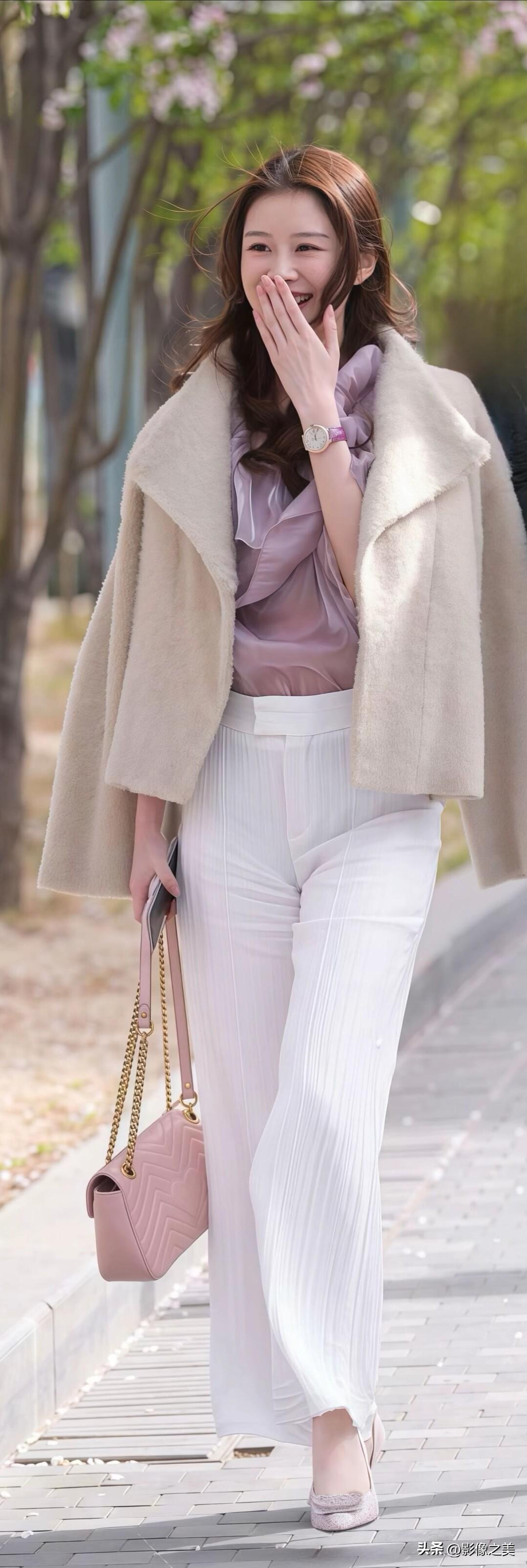 浅杏色短外套搭配柔粉内搭与白色阔腿裤,再配上同色系包包,温柔又显气质,是春日里温柔又干练的穿搭范本。