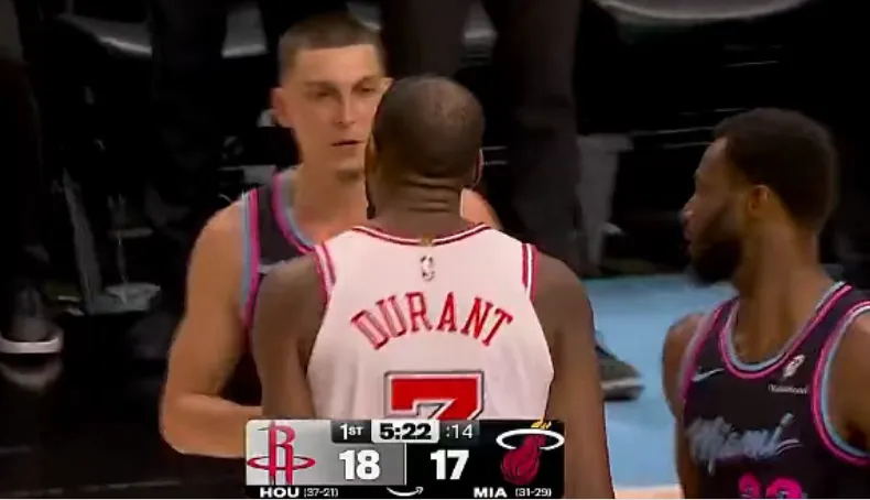 NBA常规赛火箭vs热火 谢泼德顶替缺席的贾巴里-史密斯首发火箭在开局14-4领先情况下,逐步被热火反超13分,杜兰特率领火箭在末节开局追平比分 热火随后重新取得领先优势,全场火箭105-115输给热火结束3连胜,热火结束2连败杜兰特32分6篮板8助攻2盖帽,伊森10分10篮板5助攻,申京13分6篮板3助攻2抢断