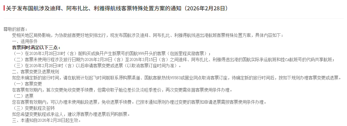 (二)客票未使用行程涉及旅行日期为2026年2月28日(含)至2026年3月15日(含)之间迪拜、阿布扎比、利雅得进出港的国航实际承运航班和挂CA航班号的代码共享航班;