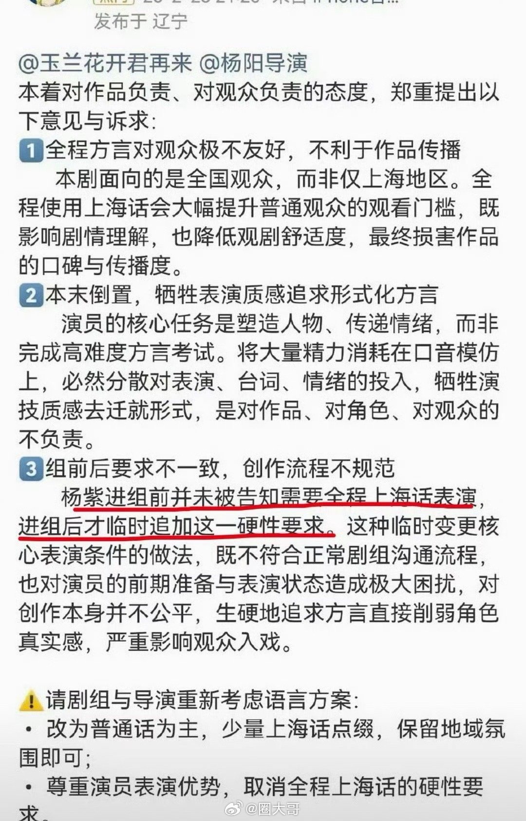 杨紫进组前不知要全程上海话表演就是说杨紫演《玉兰花开君再来》的背后,居然还有这种事情呢~杨紫粉丝发长文喊话《玉兰花开君再来》剧组,没想到杨紫进组前并不知道要全程上海话表演,就是属于杨紫敬业啊~杨紫上海话是进组后临时追加