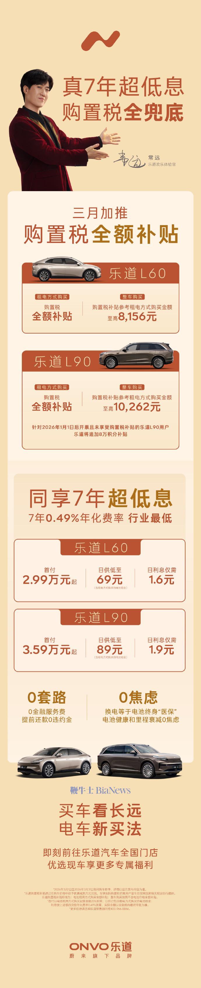 3月1日,蔚来旗下乐道汽车宣布,三月加推购置税全兜底政策,全系至高补贴10262元,同享7年超低息,日供低至69元。