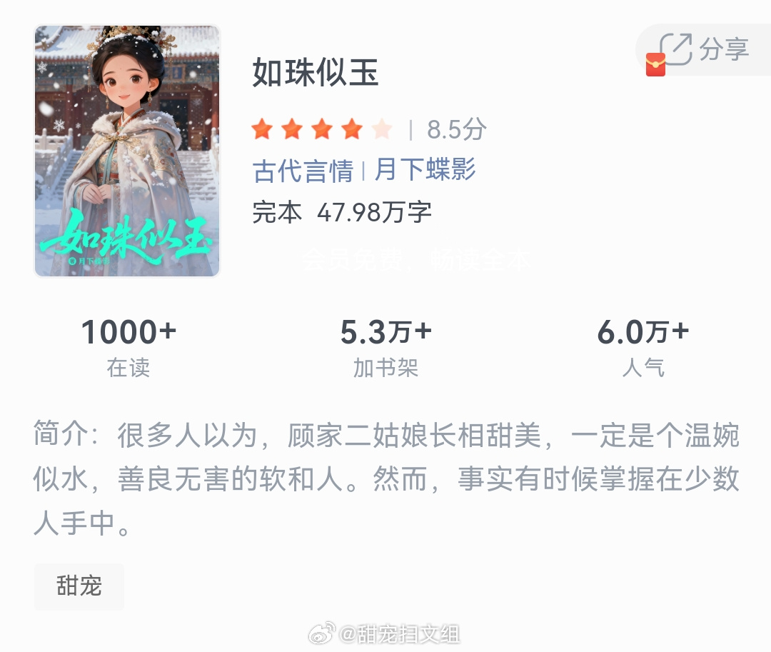 《如珠似玉》作者:月下蝶影很多人以为,顾家二姑娘长相甜美,一定是个温婉似水,善良
