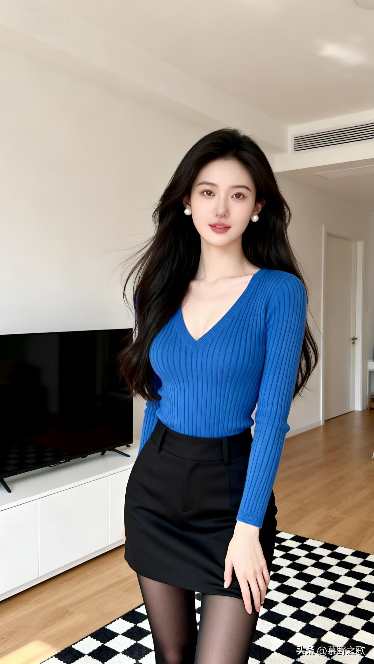 阳光落在黑白格地毯上时,我轻提黑裙裙摆,蓝衫的纹理顺着肩颈蔓延,像把天空的澄澈织进了衣料。珍珠耳坠在颈侧轻响,和客厅的暖光撞出温柔的光晕。 想起昨天写的爆款文案里,反复提到“色彩对比的张力”。此刻站在客厅里才懂,高级感从不是单一的色调,而是蓝衫的冷与黑裙的稳,是珍珠的柔与格纹的飒,是愿意为自己花时间的认真。今天不赶进度,就做自己生活里的主角,把所有美好都定格在帧里。 美女人像群 蓝色系穿搭 高级感穿搭 客厅拍照