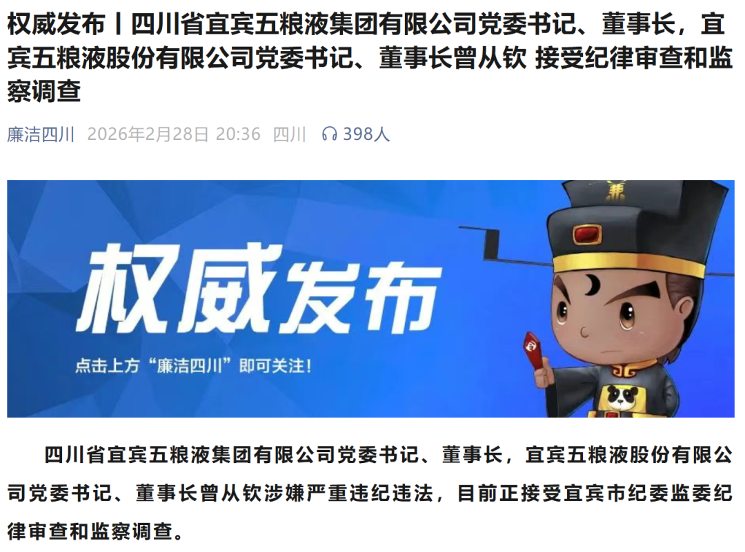 2026年2月28日晚间,白酒行业龙头五粮液(000858.SZ)突发人事巨震。据“廉洁四川”通报,四川省宜宾五粮液集团有限公司党委书记、董事长,宜宾五粮液股份有限公司党委书记、董事长曾从钦涉嫌严重违纪违法,目前正接受宜宾市纪委监委纪律审查和监察调查。