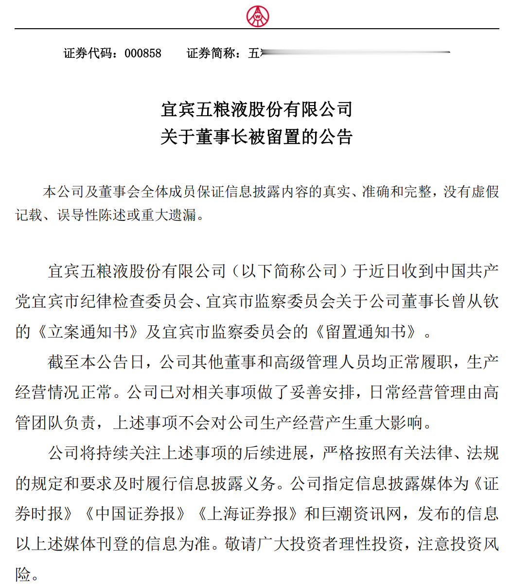 紧随官方通报,五粮液于当晚发布《关于董事长被留置的公告》。公告证实,公司已收到宜宾市纪委监委关于董事长曾从钦的《立案通知书》及《留置通知书》。截至公告日,公司其他董事和高级管理人员均正常履职,生产经营情况正常。公司已对相关事项做了妥善安排,日常经营管理由高管团队负责,上述事项不会对公司生产经营产生重大影响。