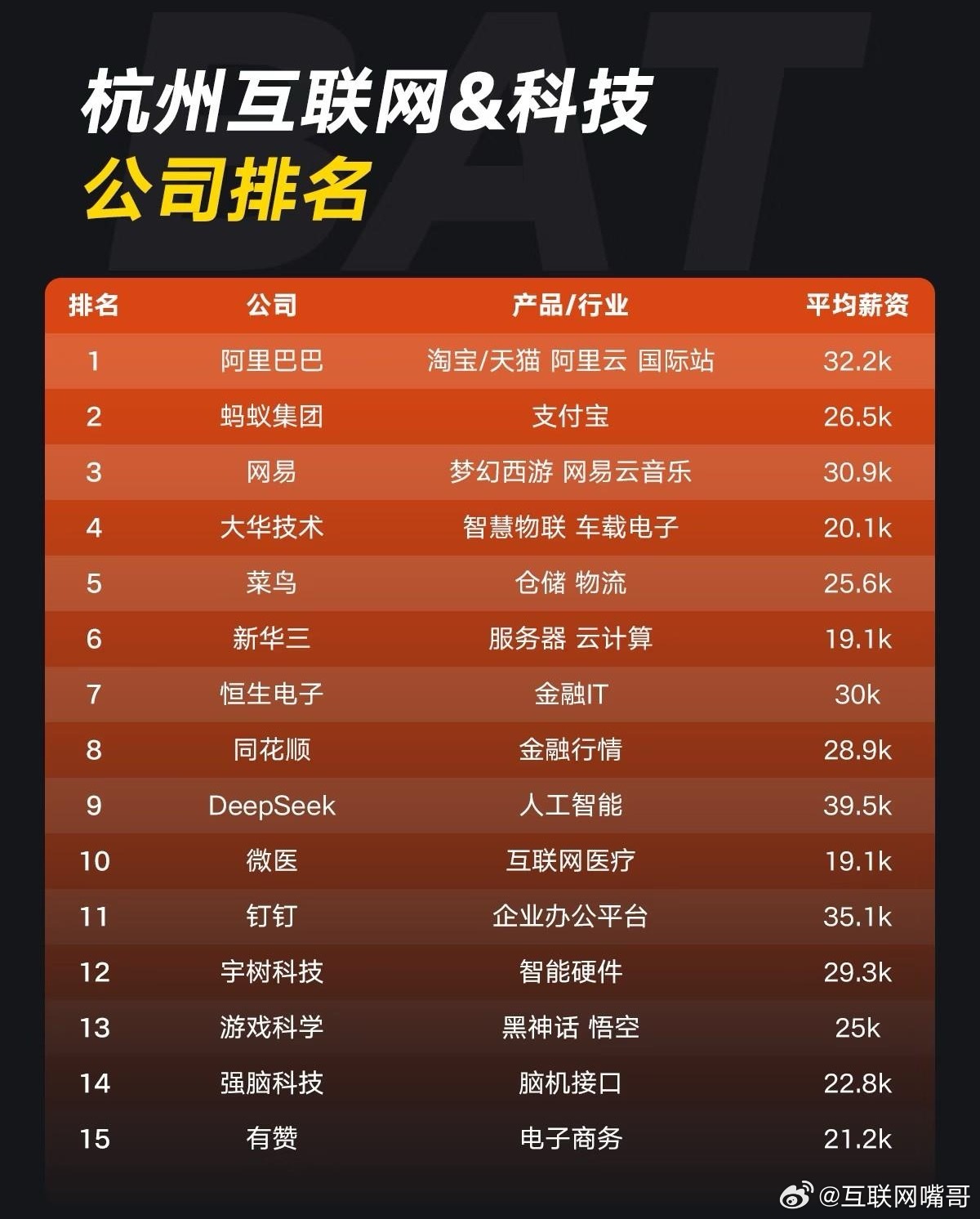 在杭州,提起互联网大厂,大家第一反应还是阿里、网易。但最近一份《杭州互联网&科技公司排名及平均薪资》,却让我看到了不一样的风向。先说说大家最关心的钱。在这份榜单里,DeepSeek以39.5k的平均月薪登顶,钉钉35.1k紧随其后,阿里32.2k、网易30.9k、恒生电子30k也都站稳了第一梯队。这些高薪背后,是完全不同的工作内容。DeepSeek的核心是大模型研发和深度学习算法,一个资深算法工程师,一天可能要迭代三版模型,压力大,但回报也高,核心岗年薪百万并不罕见。钉钉的团队则在啃企业服务的硬骨头,从产品迭代到技术架构,每一个功能更新都要服务上千万企业用户,技术深度和业务复杂度都拉满了。而阿里、网易这些传统大厂,虽然薪资也不低,但更多是在成熟业务里做精细化运营,天花板相对清晰。再对比一下行业水平。根据职友集2026年数据,杭州互联网行业的平均月薪约18k。也就是说,DeepSeek和钉钉的薪资,是行业均值的两倍还多。就算放到全国看,北京的字节、百度技术岗平均也就在36-38k,杭州的AI岗薪资已经追平甚至反超了。总而言之,杭州互联网的高薪密码,已经从“进大厂”变成了“踩对赛道”。对此,你们是怎么看的呢?