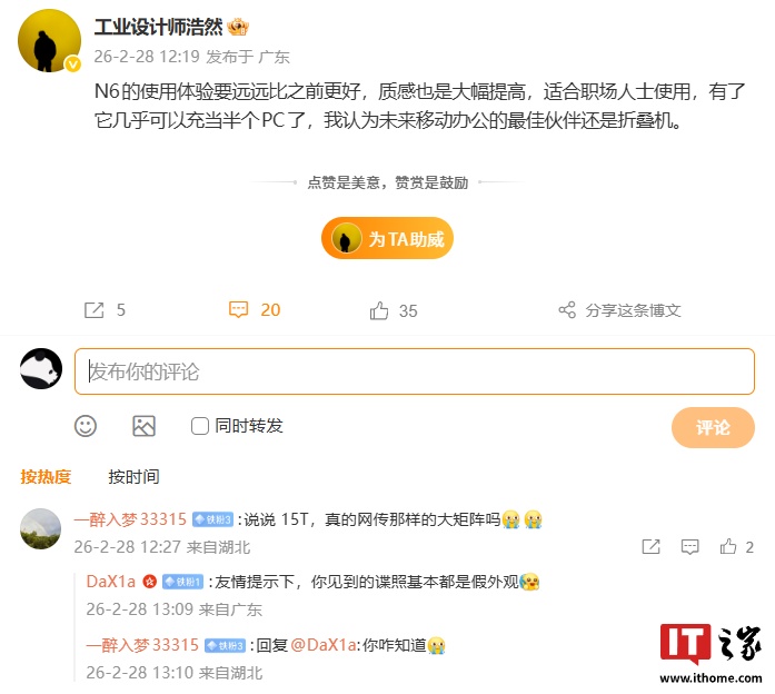 IT之家注意到,OPPO工业设计中心总经理刘浩然昨日发文“剧透”了这款折叠屏新机。他表示,FindN6的使用体验要远远比之前更好,质感也是大幅提高,适合职场人士使用,几乎可以充当半个PC。