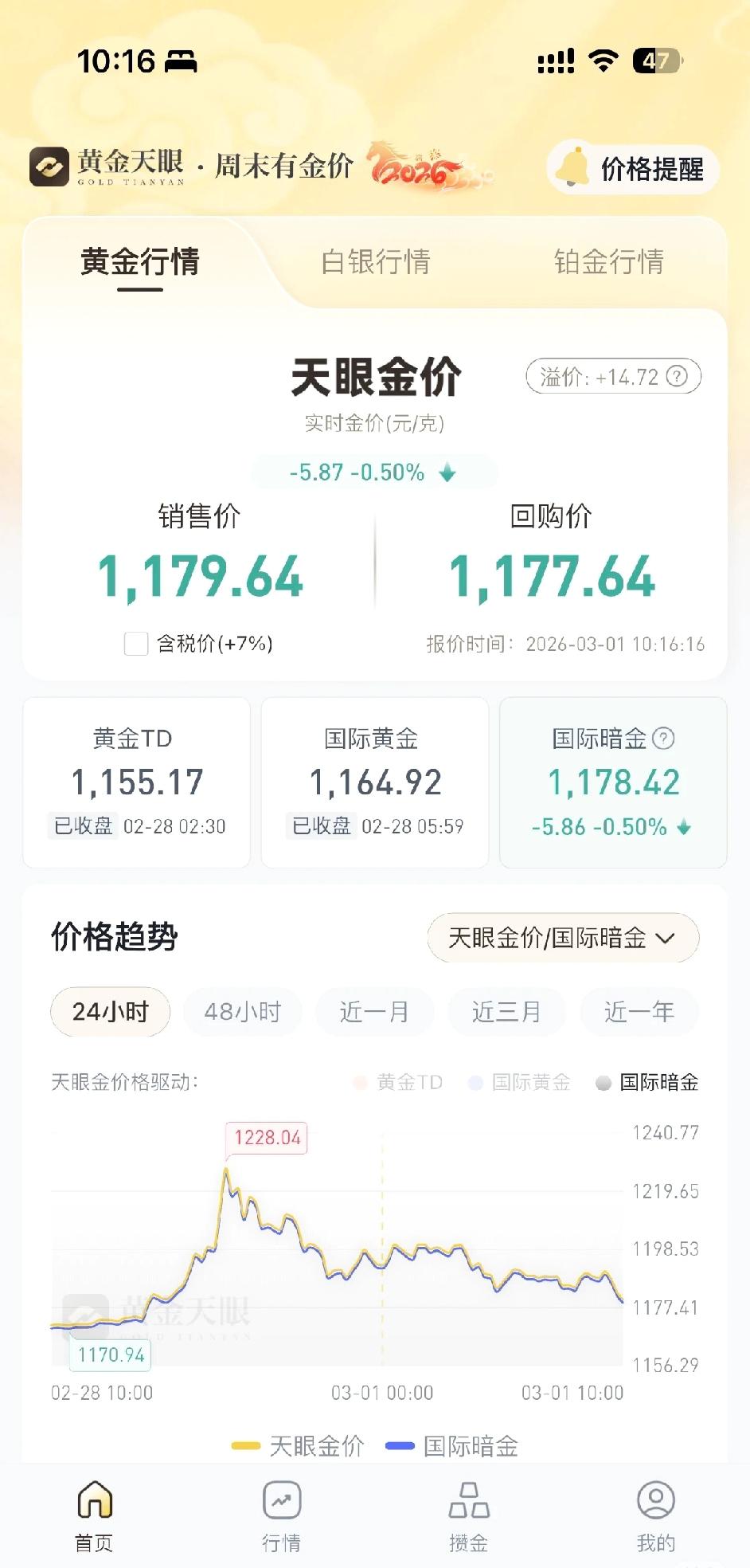 3.1 金价,哈噶的很突然,还有戏吗? 停盘的时候是1156,现在是1178。还是稳涨的。即便下午跌到1170还是涨的,只不过幅度不大而已。黄金涨势会平稳上涨,又不是股票。