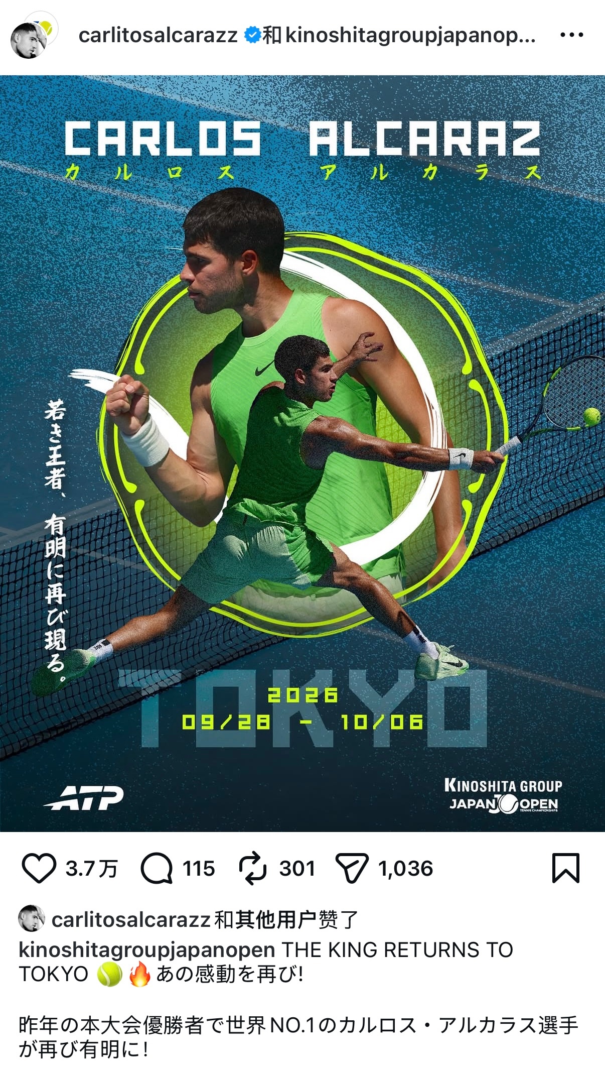 其实在今年澳网期间,ATP东京赛就已经在社媒(图2)提前预告了阿尔卡拉斯的报名,现在提前7个月就官宣确认参赛,看来各个网球赛事争抢00后双子星,都要先下手为强了
