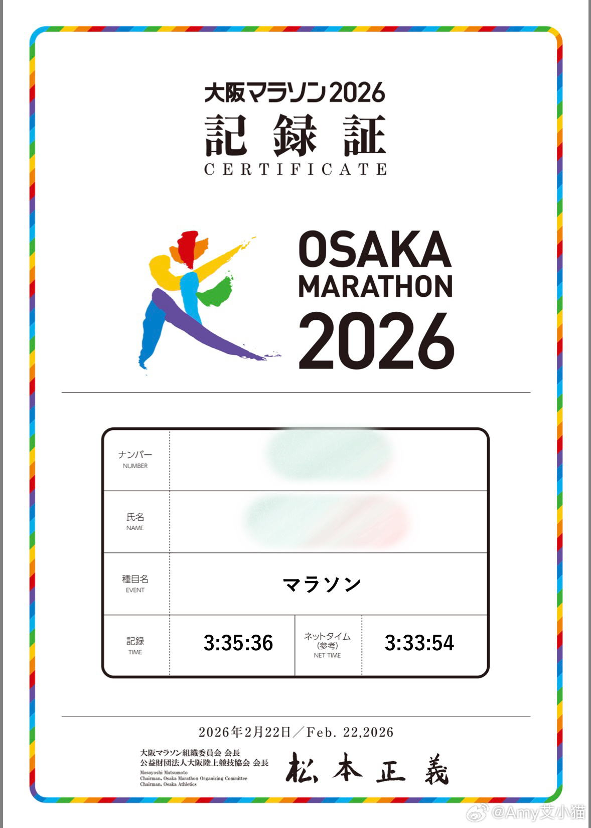 大阪马拉松3:33安全完赛🏅1月腰部受伤停跑两周赛前2个月总跑量150km今天能跑出这个成绩给自己打120分谢谢一路为我加油的你们