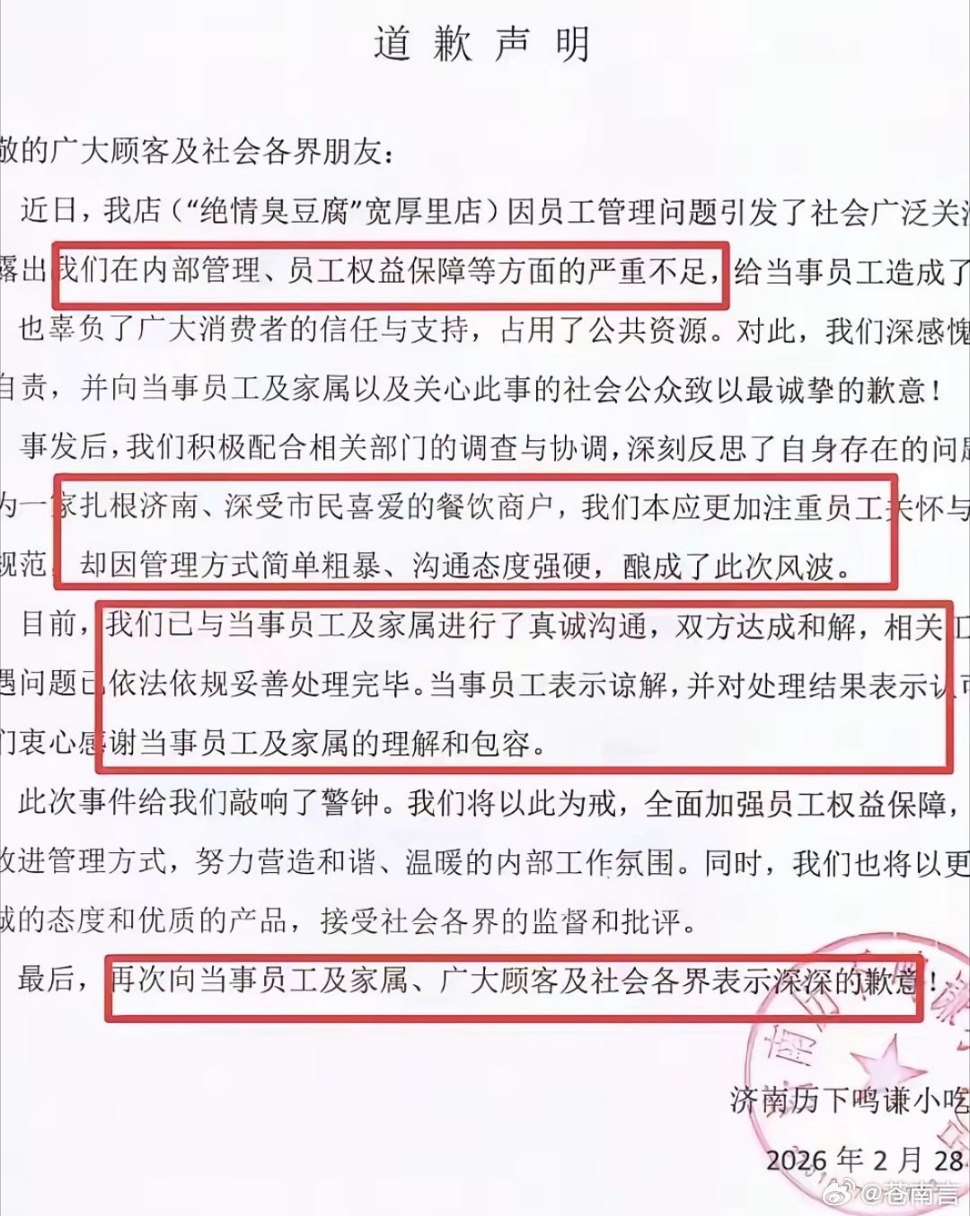 绝情臭豆腐店发布道歉声明店家坦承致歉并且足额支付了员工工资以及赔偿款。员工拿到钱以后将其中的一部分捐赠给韩红基金会。这件本无足挂齿的一件小事,因店家的专横跋扈一度吵的沸沸扬扬。员工不是奴隶,于情于理都不能太过于绝情。人家深夜11点了请假早下班一小会,跟女儿吃个团圆饭,这都不肯,于心何忍!