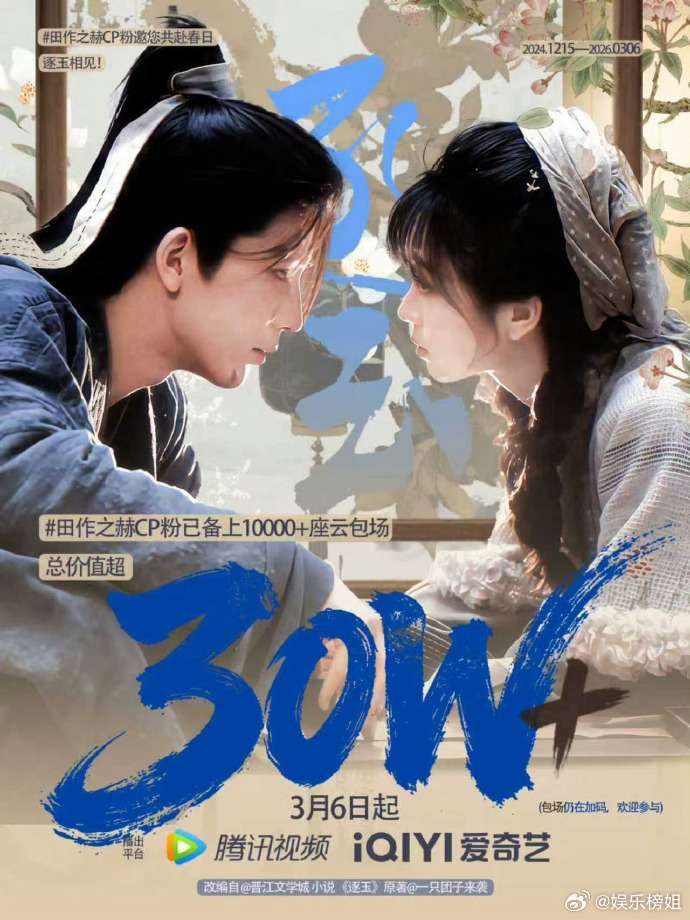 田作之赫CP粉云包场张凌赫、田曦薇CP粉为即将开播的逐玉包场10000+座,成为