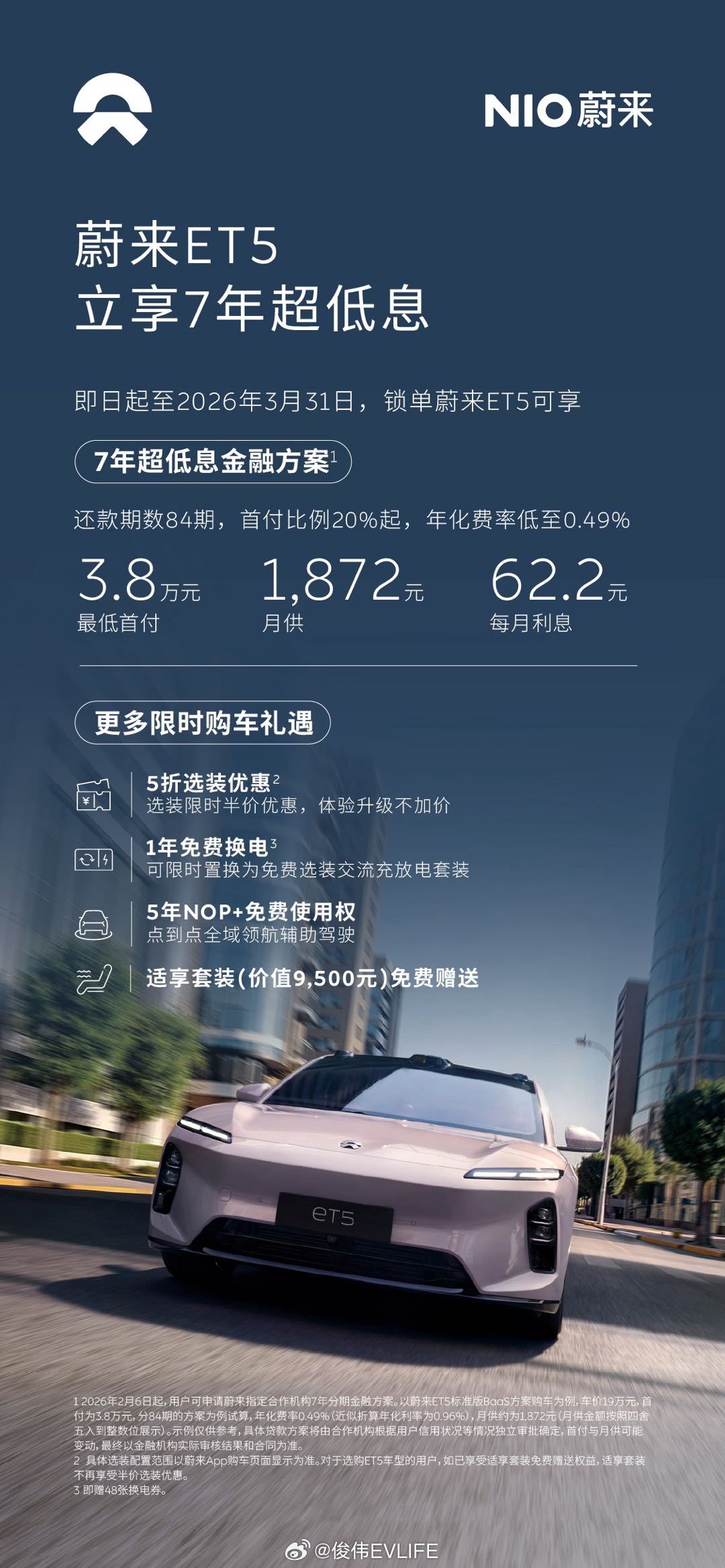 核心权益✅ 全系标配100kWh长续航电池(BaaS降10.8万门槛)✅ 5折选装优惠✅ 1年免费换电(可换交流充放电套装)✅ 5年NOP+免费使用权✅ ET5/ET5T额外送9,500元适享套装