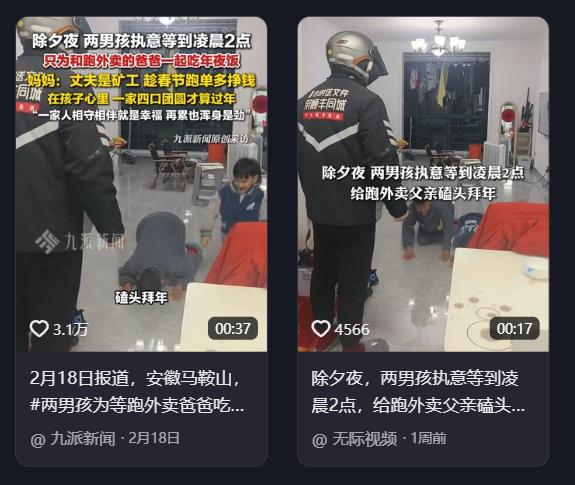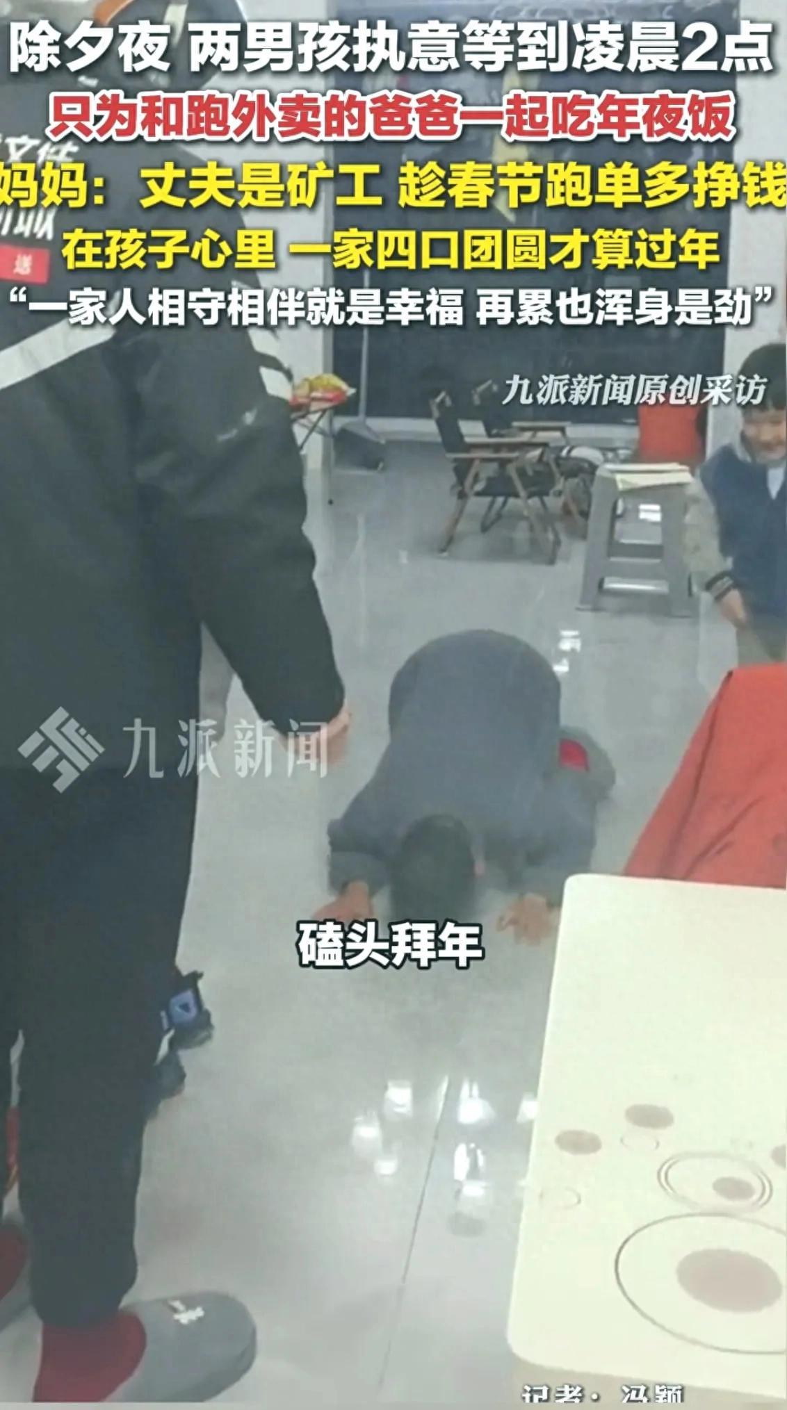 看哭了!安徽,一男子除夕夜晚饭后并没有在家陪妻儿,而是独自出门跑外卖。凌晨两点回家的时候,让他意想不到的一幕发生了! 是2026年除夕夜的安徽马鞍山。烟花早放完了,硝烟味儿散得一干二净。整条街死寂得吓人,连条野狗都看不见,就剩路灯底下一个男人的影子,被拉得老长老长。老张在门口愣了一下。 按他活了三十多年的经验,这个点儿回家,屋里肯定黑灯瞎火。老婆孩子早该睡死了,他只需要摸黑喝口凉水,把冻僵的身子往沙发上一摔就完事儿。结果门刚推开一条缝,白晃晃的灯光直接糊了他一脸。 不光灯亮着,一大两小三个人,齐刷刷杵在客厅里盯着他。老张就是个被生活按在地上摩擦的普通人。13岁的大儿子,8岁的小儿子,两台行走的碎钞机。 家中老人服药需资,开春子女学费待付,房贷车贷亦需按时偿付。生活诸般开销,皆如潺潺细流,虽缓却不停,每一笔都似重石压心。这个年怎么过?他心里门儿清。 除夕夜外卖平台疯了似的撒补贴。别人躲在暖气房里看春晚,他偏要把自己塞进电动车的挡风被里,出去抢那些单价翻倍的肥单。 从天擦黑一直干到后半夜,风跟刀子似的往骨头缝里钻。手指头早就没知觉了,全靠肌肉记忆拧油门。两条腿冻得跟木头桩子一样,胃里饿得直冒酸水。然而,他脑海中的那把算盘正以极快的速度噼里啪啦地作响,精准盘算着每一个细节,仿佛是一台精密运转的仪器,不放过任何一丝利益的可能。 "这单能挣十块。"他死盯着手机屏幕上跳动的数字,心里立马换算成大儿子文具盒里能多几支铅笔。这套专属于底层老爹的财务模型,就是他扛住零下十几度的唯一燃料。收工一算账,兜里多了好几百。值了。 揣着这份硬邦邦的成就感推开家门,他直接被眼前的场面砸懵了。餐桌上的饭菜早就凉透了,油花结了一层又一层,明显是在微波炉和冷空气之间来回折腾了无数遍。老婆坐在沙发边上,眼眶熬得通红,愣是一句埋怨都没有。 换别人,一句"大过年的都不着家"早甩脸上了。但她硬是把丈夫的缺席,翻译成了另一种语言。 等人的那几个钟头,她一遍一遍往两个儿子脑子里灌输一个概念:你爸现在正在外头替我们一家老小挨冻呢。 这叫什么?这叫教科书级别的言传身教。她不熬鸡汤,她直接把老张在寒风里冻裂的手、跑烂的腿,原原本本摆到了孩子面前。 接下来发生的事,直接把老张的防线击穿了。他尚未来得及卸下那冰冷的外卖箱,两个儿子蓦地腿一软,膝盖狠狠砸落在客厅地板,“咚”地一声闷响,似重锤敲击人心。 紧跟着就是一个结结实实的头磕下去。带着哭腔的童声在半夜的屋子里炸开:"爸爸辛苦了,给您拜年!"老张手里的头盔脱了手,咣当一声砸在地砖上。 这个在外头连摔个跟头都要赶紧爬起来看看有没有超时扣钱的硬汉,身上某根绑了一整年的弦,啪地断了。泪水如决堤之水般汹涌而下,砸落在地。那汹涌之势,让人连佯装镇定的片刻都难以挤出,瞬间便被这滂沱泪意淹没。 别扯什么封建糟粕。这俩十来岁的孩子压根不懂什么繁文缛节,他们只是在自己那点可怜的认知里,翻出了最高规格的动作,去接住老爹冻得发紫的那双手。 区区几百块的加班费,何足挂齿?这般微薄之数,仿若沧海一粟,难以慰藉劳动者付出的辛劳,实在不值一提。 就在这一瞬间,老张憋了一整年的窝囊、委屈、心酸,被这一声哭喊彻底清了账。这笔情感补偿的数额,大到够他再咬牙死磕十年。 真正的团圆,绝非仅是众人齐聚这般简单。它蕴含着心灵的契合、情感的交融,是灵魂的相拥,而非躯体的机械拼凑,如此方为团圆真意。 男人在前头蹚着冰碴子玩命,女人在后方守着一盏不灭的灯死撑,孩子用膝盖丈量出那份沉甸甸的心疼。这三个角死死焊在一块儿,闭环了。 2026年的这个凛冬深夜,没有什么惊天动地的大场面。就一桌热了又凉的饭菜,和一份被真真切切看见了的尊严。