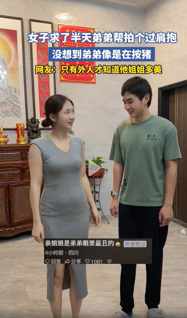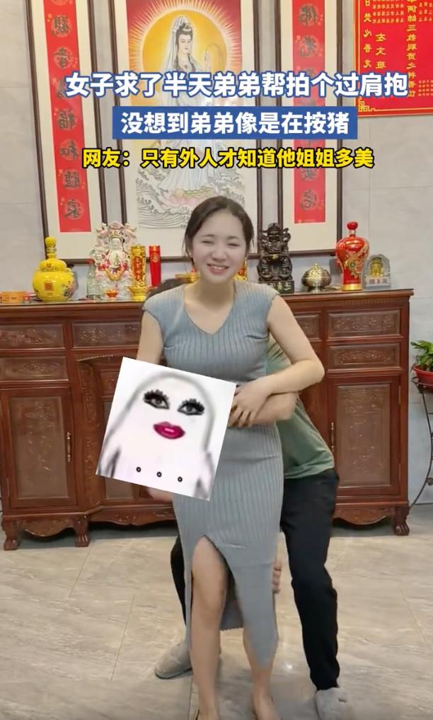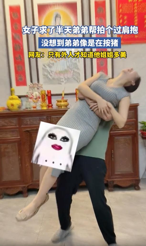“敷衍到极致就是这样吧”2月28日福建,一位姐姐本想着拍个姐弟互动视频,结果硬生生被弟弟整成了按猪现场,这一幕让不少人直呼,简直太硬核了。 事情是这样的,这位姐姐穿着灰色修身长裙,打扮得漂漂亮亮,满心欢喜求了弟弟半天,就指望拍个唯美的过肩抱。可这弟弟踏拉着拖鞋,双手死死箍住姐姐的腰部,猛地发力往前一倾,那架势活脱脱像是在搬沉重的麻袋。没成想姐姐瞬间失重后仰,表情扭曲想笑又痛苦,犹如按猪一样,笑翻了全场 这事发到网上,评论区都笑翻了。 有网友调侃说,只有外人才知道姐姐多美,姐姐在弟弟眼里估计就是世界上最丑的。 这句话说的有一定道理,但是我觉得,不管外人觉得多好看多有气质,到了亲弟弟手里,姐姐就是个纯纯的道具,完全没有任何怜香惜玉可言。 平时咱们总刷到姐姐血脉压制弟弟的视频,弟弟做错事,只要姐姐一登场瞬间就能拿捏,可反过来看这一幕,其实也是亲情的另一种表现。弟弟虽然在帮忙,但那种因为太熟而产生的敷衍和嫌弃,反而让强势的姐姐彻底没了脾气,其实仔细琢磨琢磨,这不就是咱们平凡家庭里那种温馨又闹腾的姐弟日常嘛! 女子求弟弟帮拍过肩抱 弟弟像在按猪
