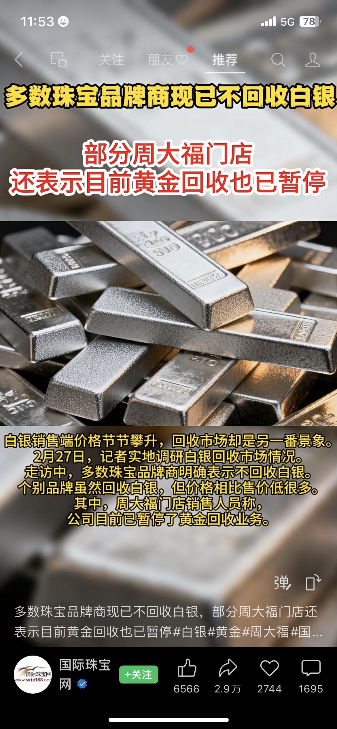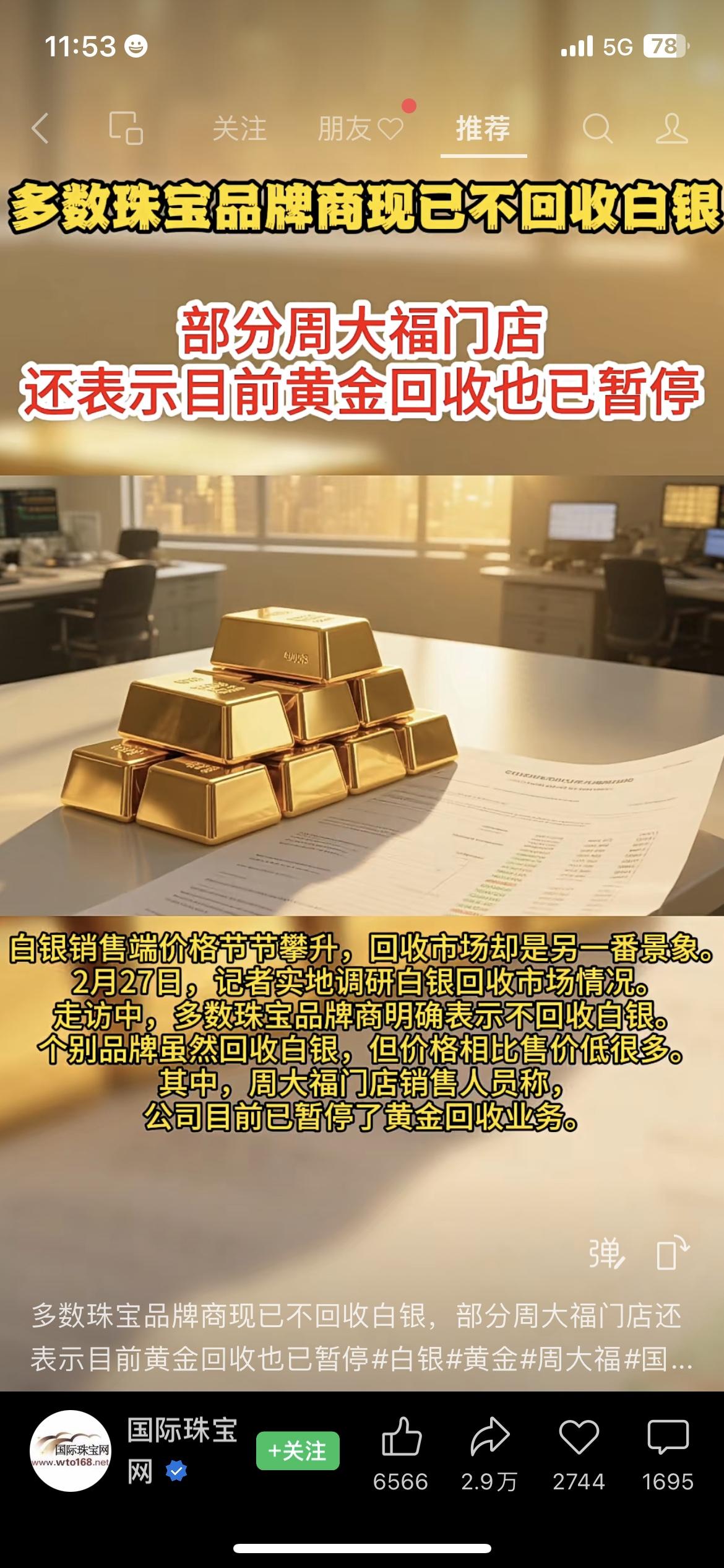 我妈今早急冲冲发微信:“我的金项链想变现,咋没人收了?” 一查才知道,现在多数珠宝品牌已不回收白银,就连部分周大福门店都暂停了黄金回收业务。 明明白银售价节节攀升,回收市场却一片冷清,个别品牌即便回收,价格也比售价低一大截。 身边有朋友去年底跟风买了一堆黄金首饰,现在想套现,跑遍门店都碰壁。说白了,黄金首饰溢价高、变现难,压根不适合做投资。 市场有风险,投资需谨慎,以上内容不构成任何投资建议。 黄金回收 白银投资 理财避坑白银黄金变现