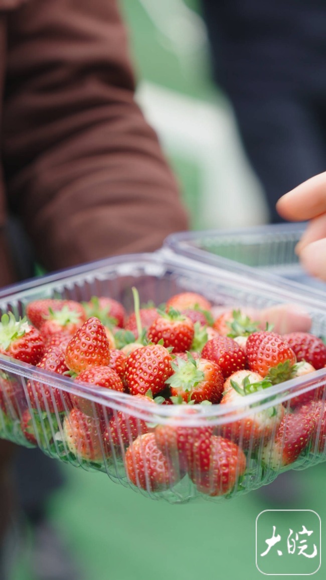 柿树岗乡数字农旅果蔬大棚项目落户在周楼村,这里拥有8800平方米的高科技温室,项目涵盖农业生产、休闲采摘、劳动教育科普、旅游体验等多种功能于一体,尤以草莓和黄桃为主打产品,其中空中草莓不沾泥土、悬空种植,香野馥郁、粉玉清甜、奶油草莓新奇诱人,包含多个品种。“2025年,在‘书记三人行’直播间的一场直播中,20分钟售卖超2000斤黄桃。2025年全村草莓线上销售量突破1万斤。”柿树岗乡周楼村党支部书记王学祥说,得益于“书记三人行”直播间的帮助,该村连续两年总收入突破千万元。