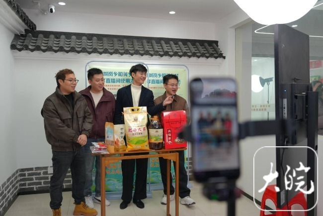 2月27日上午,肥西县柿树岗乡和美乡村共享直播基地里热闹非凡,有不少村民在接受专题直播技能培训,也有村民将自己的农产品整齐摆放,等候展示,更有村干部在镜头前推介农产品……