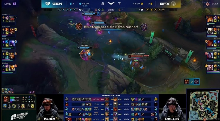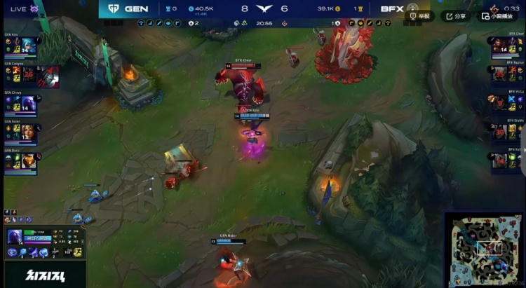 [23:39]BFX上野强行抓死Kiin格温,拆掉了GEN的中下双一塔!GEN其余四人抱团拿下大龙!双方经济差3K不到!
