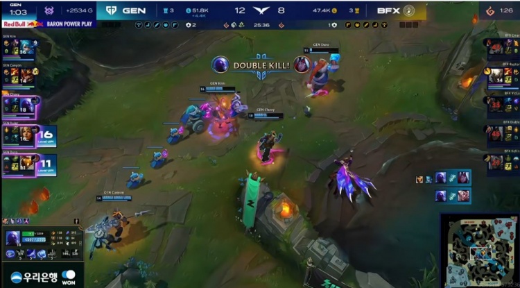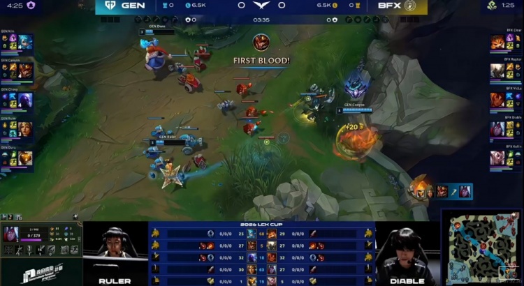 [20:35]下路交手,Chovy瑞兹一套伤害强行灌死了VicLa岩雀,BFX则是换掉了Duro巴德,后续团战Canyon皇子留人自己被集火击杀,但是Ruler希维尔切死了Diable维鲁斯,BFX没有输出点了!GEN双C猛猛输出接管团战!最终是GEN的1换4!