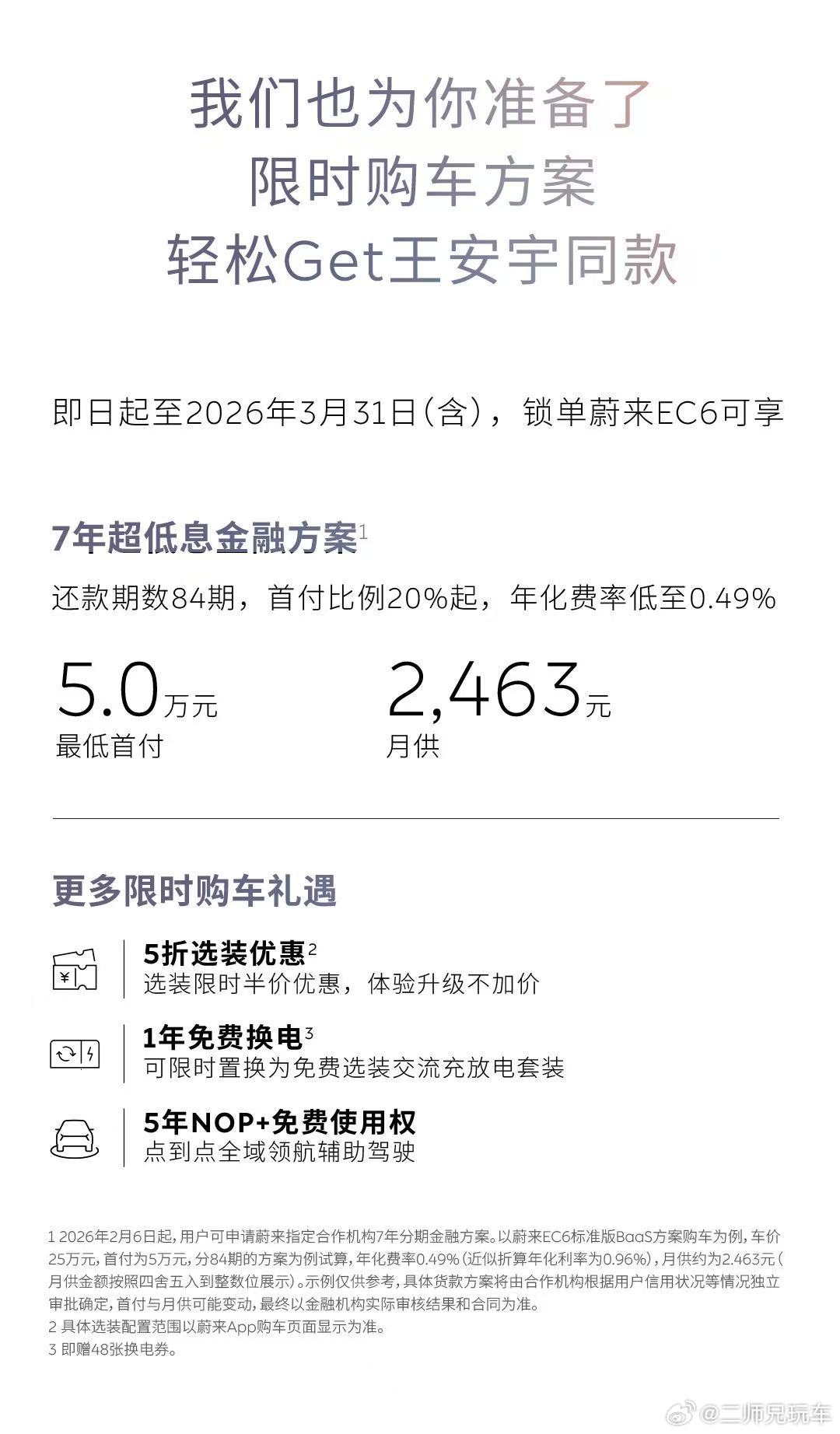 主要是今天刷到王安宇同款的蔚来EC6了,感觉这车不光配色漂亮,配置也高,而且三月恰好有个7年的超低息金融方案,首付5万块,月供两千多就能开回家,购车压力确实下降了很多。