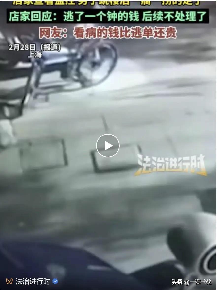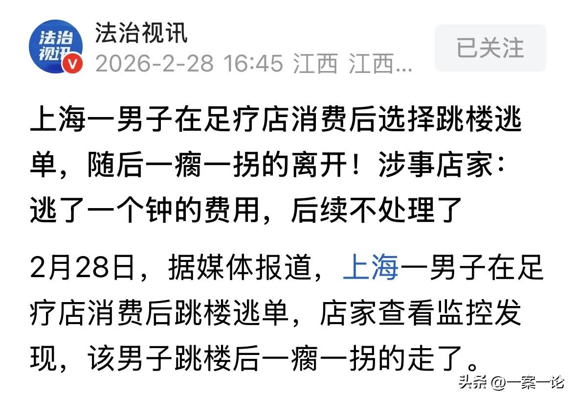 上海,男子在足疗店点了个技师,1小时后,服务结束,男子晃晃悠悠来到窗边,瞅准时机一跃而下,逃单跑了!商家气愤不已,可调出监控看到男子跳楼后那一瘸一拐的样子,又哭笑不得,决定不追究了。网友:这下看病的钱比逃单还贵了。 当天,男子晃晃悠悠进了店,点了个钟享受服务。 1个钟头过去,技师完成服务。 到了买单的时候,男子不知道是兜里真没钱,还是压根就想白嫖,他做出了一个惊呆店家的举动,跑! 但男子没走正门,为了躲前台,他心一横,直接从二楼的窗户跳了下去。 他可能还寻思,天高任鸟飞,这回省了百十来块钱! 那种逃票成功的窃喜可能还没来得及涌上心头,现实就给他上了一课。 店家听到动静不对,赶紧跑出来看,人早就没影了,只剩下空荡荡的窗口。 店家气坏了,为了留下证据,他们赶紧调监控,报警的时候好拿给警方看。 结果监控画面一放出来,店里的人都乐了,连刚才的气都消了一半。 画面里,那男子确实是落地了,但根本不像电影里那样潇洒地翻滚起身。他是结结实实地拍在了地上,虽然没摔死,但看着都疼。 只见他在地上缓了好半天,才龇牙咧嘴地爬起来。 起来后也没跑,而是弓着腰,一条腿拖着另一条腿,一瘸一拐地往外挪,那姿势就像刚从战场上下来的伤兵,每走一步都像是在受刑。 店家看着监控里那狼狈样,哭笑不得。 这男子为了逃这一个钟的钱,把自己摔成这样,光是去医院拍个片子、拿点跌打损伤的药,恐怕都不止这点钟费。至于吗? 记者后来采访店家,问这事儿后续怎么处理,是报警还是去要账? 店家倒是看得开,直接说:算了,他逃了一个钟的费用,我们也不追究了。 这话里透着一股“得饶人处且饶人”的通透,也带着点看笑话的心态。都摔成这样了,再去要钱显得咱不厚道,其实是知道他这回亏大了。 有人说,看他走路那姿势,估计骨折是跑不掉了,这逃单成本太高了,属于典型的‘为了芝麻丢了西瓜,还把自己砸伤了’。 老板智慧啊,死追不放说不定会被反告一把。参考小偷偷窃被发现,摔死了还要赔钱的案例…… 《治安管理处罚法》第49条规定:盗窃、诈骗、哄抢、抢夺、敲诈勒索或者故意损毁公私财物的,处五日以上十日以下拘留,可以并处五百元以下罚款;情节较重的,处十日以上十五日以下拘留,可以并处一千元以下罚款。 男子既然去足疗店享受了服务,那就得给钱,但他为了赖掉这百十来块钱,不走寻常路直接跳窗跑路。 在法律上,这不仅仅是欠钱不还的民事纠纷,更是一种“诈骗”行为。也就是想用偷偷溜走的方法,把本该付给店家的服务费非法占为己有。 虽然店家说“算了、不追究了”,但这只是店家放弃了民事索赔,并不代表警察不管。只要店家报警,或者警察在监控里看到了,男子就得面临行政处罚。 按照这条法律,他至少得被关进拘留所5到10天,还得罚款。 要说男子逃单这件事,那就是典型的“赔了夫人又折兵”,为了点芝麻粒大的利益,把自己折腾进局子里,实在是蠢到家了。 对于这件事,你怎么看? 欢迎关注@一案一论