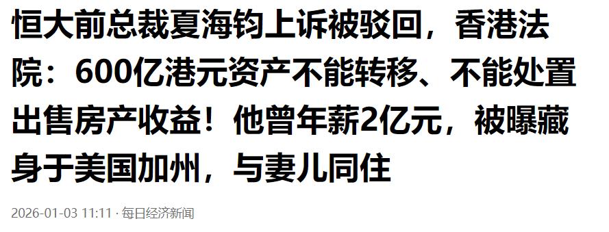 “藏到美国也没用!”刚被曝在加州躲了四个月的恒大前总裁夏海钧,最近彻底笑不出来了,香港法院驳回了他的上诉,冻结的600亿港元资产一分都动不了。 据权威媒体披露,夏海钧从2025年8月开始,就悄悄躲在了美国加州的尔湾市,和妻儿住在当地的豪宅里,这一躲就是四个月。 他之所以选择加州,可不是单纯为了避世,而是早有准备——早在几年前,他就通过妻子的名义,在加州购置了三处房产和四辆豪车,总价值高达2400万美元,这些资产全都登记在妻子名下,看似和他没关系,实则都是他暗中掌控的“退路”。 更让人不齿的是,他在躲去美国之前,就已经开始疯狂套现避险。在恒大债务危机刚刚显露苗头的2021年,他就密集抛售恒大物业、恒大汽车的股票,还批量出售恒大系的美元优先票据,累计套现超过10亿港元。 甚至在2024年,他还以8200万港元的价格,亏本出售了香港北角的柏傲山豪宅,比五年前购入时亏了7400万港元,明眼人都能看出来,他这是在急着清空资产,为跑路做准备。 他之所以要这么急着跑路、转移资产,核心原因就是他手上不干净。2024年9月,中国证监会发布行政处罚决定书,明确指出夏海钧在担任恒大总裁期间,组织安排编制虚假财务报告,手段特别恶劣。 光是2019年和2020年两年,恒大就通过提前确认收入的方式,虚增收入超过5600亿元,虚增利润近920亿元,而这一切的主导者,就是夏海钧。 除此之外,他还主导了恒大债券的欺诈发行,几年间先后发行了多只公司债券,总规模超过200亿元,而这些债券的发行文件,全都引用了虚假的财务数据,误导了无数投资者。 也正因为如此,证监会对他处以1500万元罚款,还采取了终身证券市场禁入措施,也就是说,他这辈子都不能再从事证券相关工作。 面对追责,夏海钧没有选择主动承担责任,反而一门心思想着逃避。2024年6月,香港法院应恒大清盘人的申请,对他颁发了全球玛瑞瓦禁令,也就是我们常说的跨国资产冻结令,明确禁止他转移香港辖区内的600亿港元资产,也禁止他处置柏傲山豪宅的出售收益。 这一下,夏海钧彻底慌了,他先后两次提起上诉,试图撤销这份资产冻结令,找了各种理由辩解,却都被香港法院一一驳回。 直到2026年1月2日,香港上诉法庭最终裁定,驳回他的所有上诉请求,还明确禁止任何一方再通过口头聆讯的方式,要求重新考虑这份裁决,这意味着,他被冻结的600亿港元资产,一分都动不了。 可能有人会问,他都躲到美国了,香港法院的裁决还能管到他吗?答案是肯定的。要知道,全球玛瑞瓦禁令是跨国生效的,不管他躲在哪个国家,只要涉及到这600亿港元的资产,不管是转移还是处置,都是违法行为。 而且,他妻子在美国的那些资产,也已经被恒大清盘人盯上,恒大方面已经向法院申请,将他的妻子追加为被告,那些看似和他无关的资产,迟早都会被追查。 回想夏海钧的一生,其实挺让人唏嘘的。他毕业于名牌大学,拥有博士学位,早年在中信集团打拼十年,凭借自己的能力坐上了高管位置,后来加入恒大,更是一路顺风顺水,成为了年薪上亿的“打工皇帝”。 可他却在利益面前迷失了方向,为了一己私利,不惜编制虚假财务报告、欺诈发行债券,最终落得个身败名裂、资产被冻结、四处逃窜的下场。 说到底,夏海钧的结局,都是他自己选的。他以为躲到美国就能高枕无忧,以为转移资产就能逃避追责,却忘了一个道理:法网恢恢,疏而不漏。不管你身居高位,不管你躲到世界哪个角落,只要触犯了法律,只要损害了他人的利益,就一定会受到法律的制裁。 现在的他,躲在美国的豪宅里,面对的不仅是资产被冻结的困境,还有随时可能到来的法律追责,曾经的风光无限,如今只剩下无尽的煎熬,这大概就是贪婪者最终的归宿。