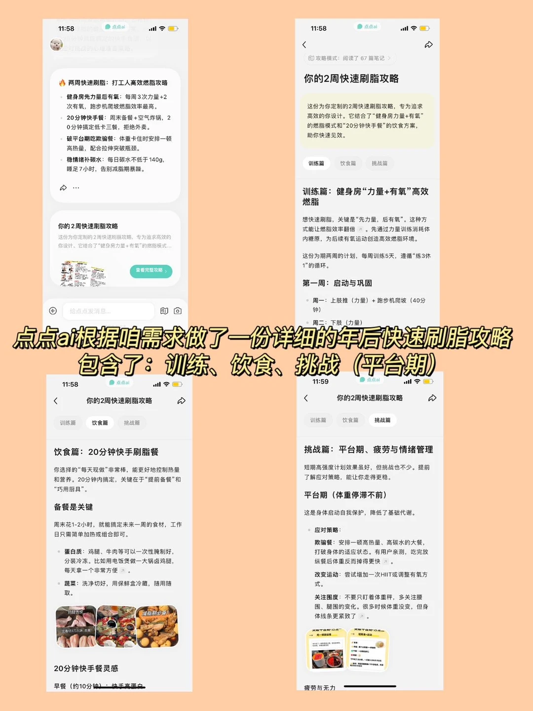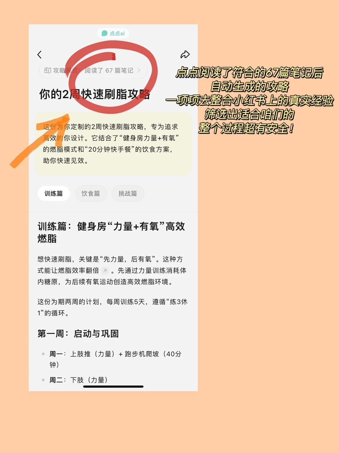 下载点点App,点亮“攻略模式”输入更具体的问题,回复点点ai的提问,让点点ai更加深入的了解咱们需求,就能看到点点阅读了符合的67篇笔记后,自动生成的攻略!训练、饮食全都有~