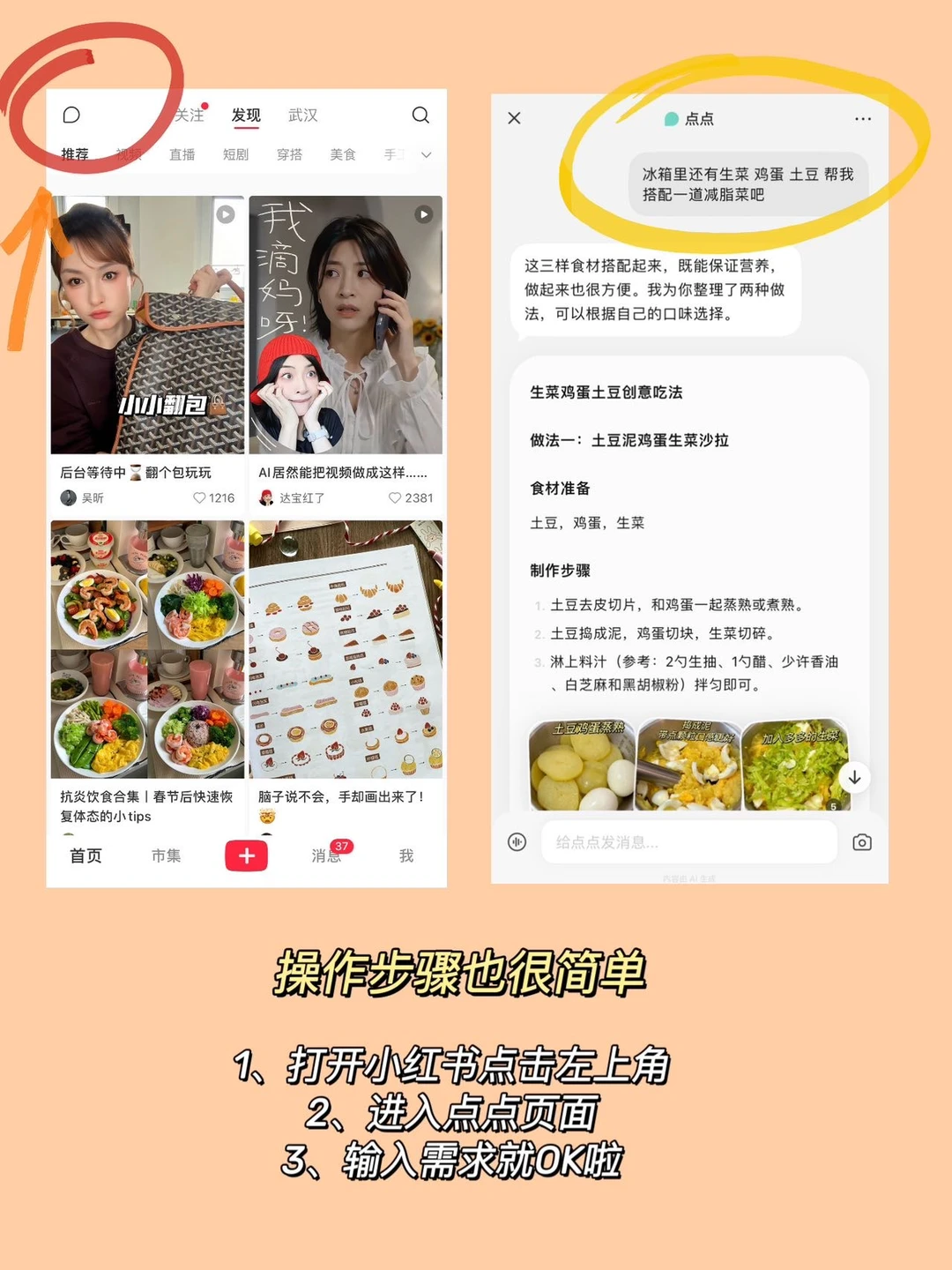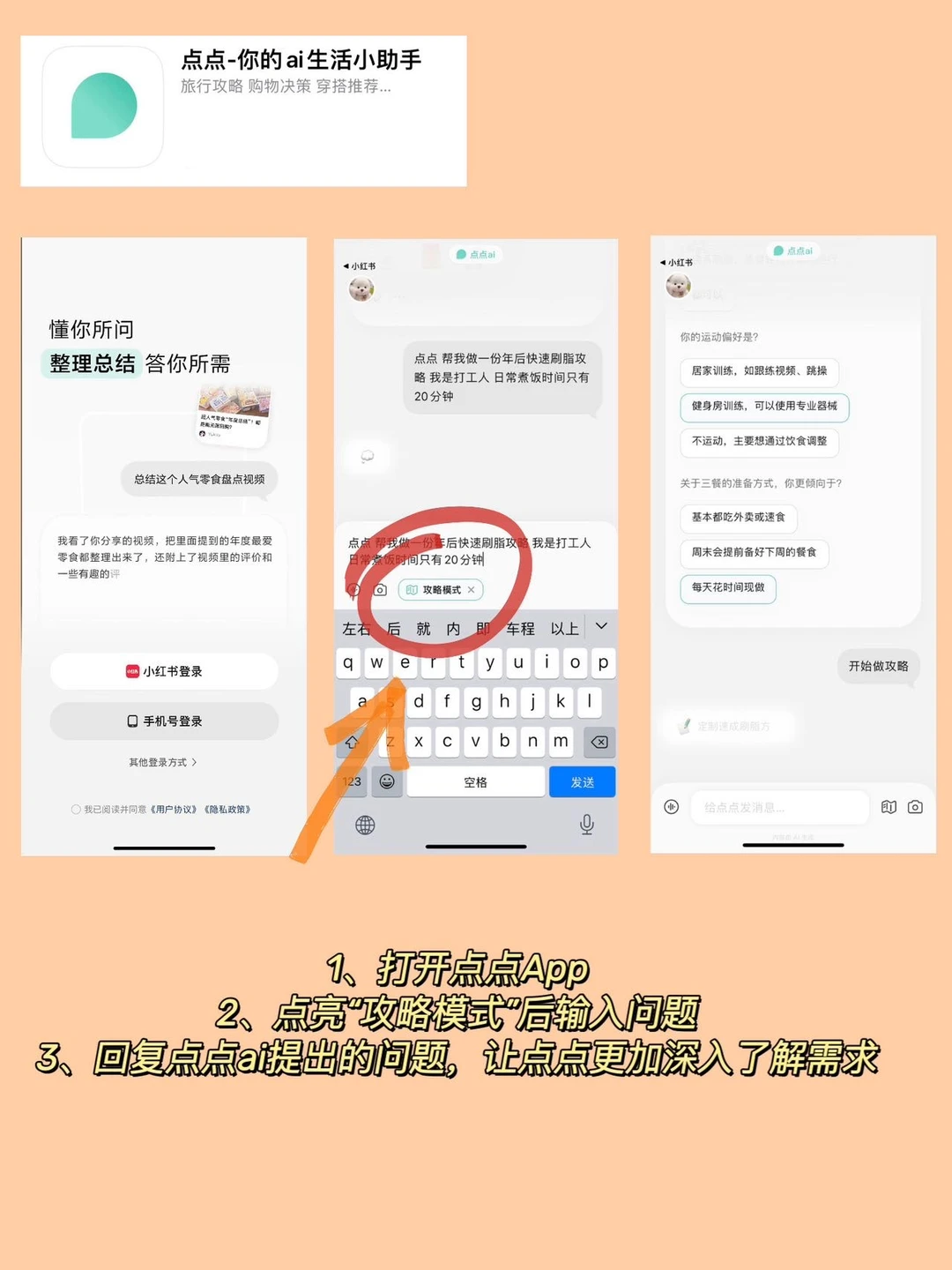 1️⃣ 打开在首页左上角点图标,进入点点ai页面,在对话框输入咱们问题,它会立刻整合上的真实用户经验做推荐!或者拖拽笔记问点点,也很丝滑便捷