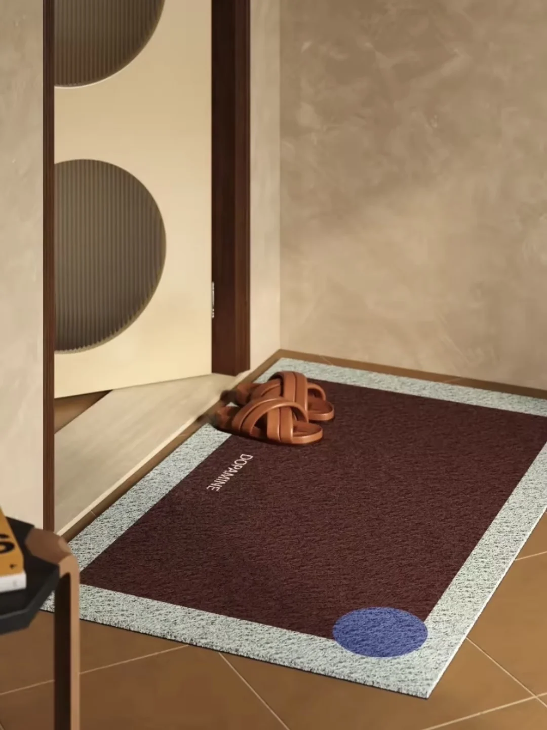整张地垫以中古蓝色为基底 米白与赭色色块穿插其中 形成冷暖交替的节奏 边缘点缀小面积波点 打破块面厚重感 又不会过分跳跃 几笔色块就把玄关区域划分出来 干净利落 适合多种家居风格 -