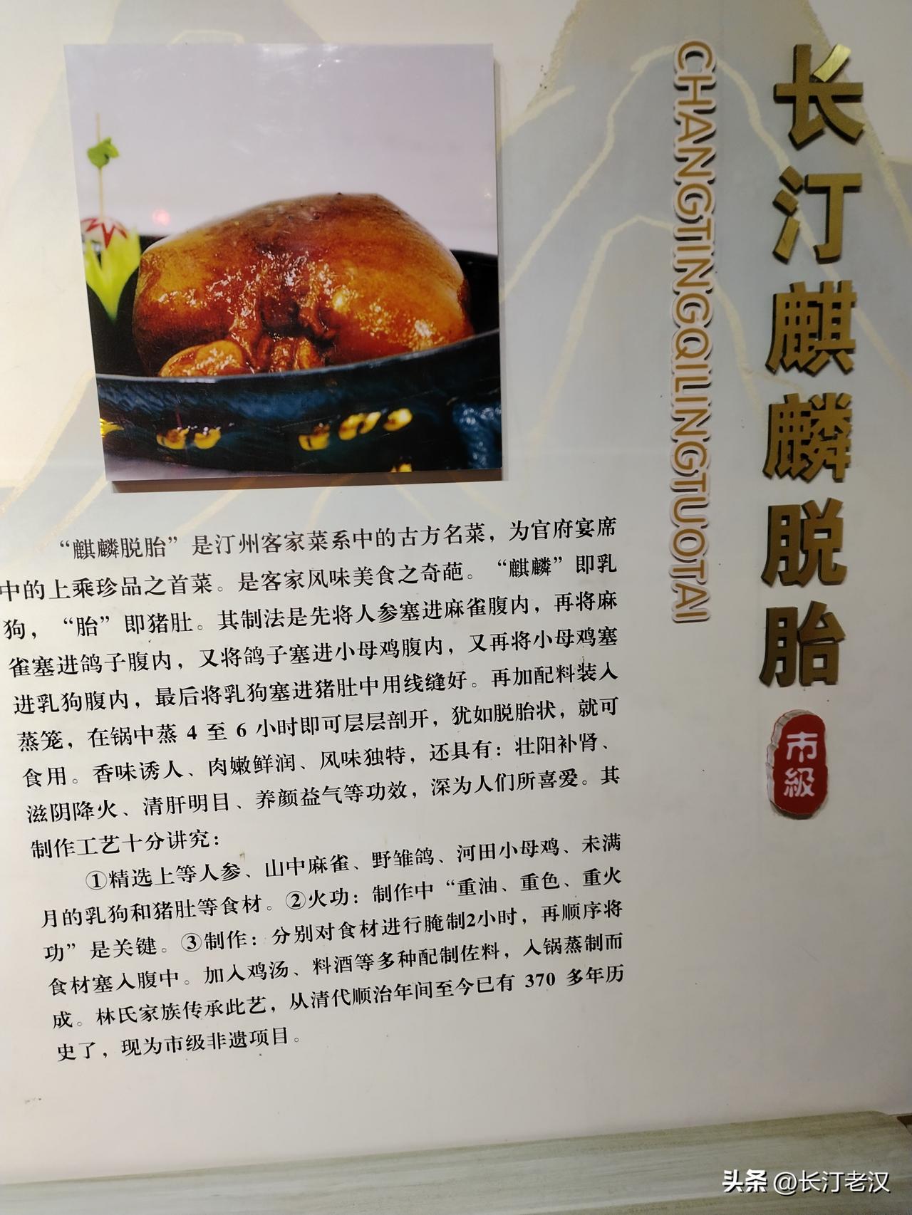 谁说狗肉不得上席,我们福建长汀有道客家名菜,叫麒麟脱胎。这道菜可不一般,是宫廷上乘的佳肴名菜。只是把狗肉加上了包装,用猪肚进行了包装,猪肚叫胎,给乳狗取了个好听的名字叫麒鳞。 麒麟脱胎这道名菜,是客家先民的皇族带来的,在客家地区流传了千年,列入了长汀的世遗名录。这道菜是把人参放在麻雀肚里,再放进鸽子肚里,又放入小母鸡肚里,再放入乳狗肚里,最后放入猪肚里,配上名贵中药,放入锅中蒸熟即可吃了。 这道菜成了我们汀州客家人宴席的上等名菜,香味扑鼻,味道鲜美,特别是那狗肉,吸收了各种美味,再加上狗肉的胶质,鲜嫩可口,那汤汁更是好吃,营养丰富。 这道菜既有壮阳补肾,滋阴降火,补肝明目,养颜益气的功能。因此,长汀客家人认为狗肉大补,要吃小孩大便的狗肉最好,小孩遗尿都要吃,冬至一定要吃。现在狗肉比羊肉贵了,要挂狗头卖羊肉了,因此要吃到道地的麒麟脱胎这道菜也不容易了。