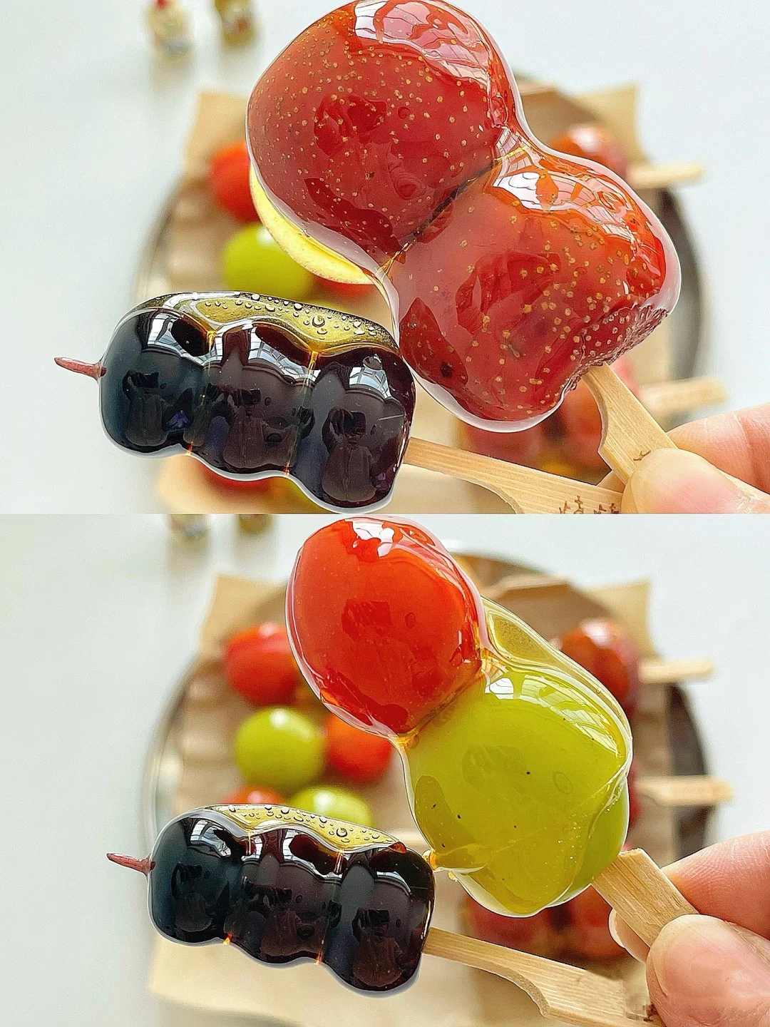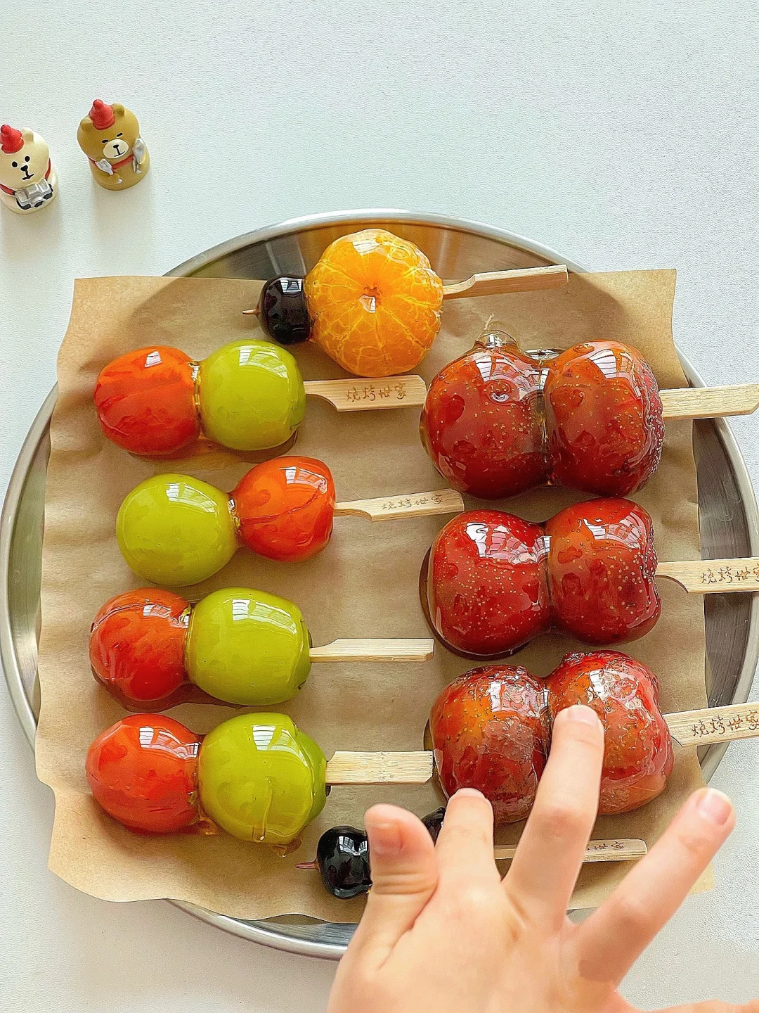 🔹串好的水果最后裹上一层糖浆放在油纸上晾凉即可。