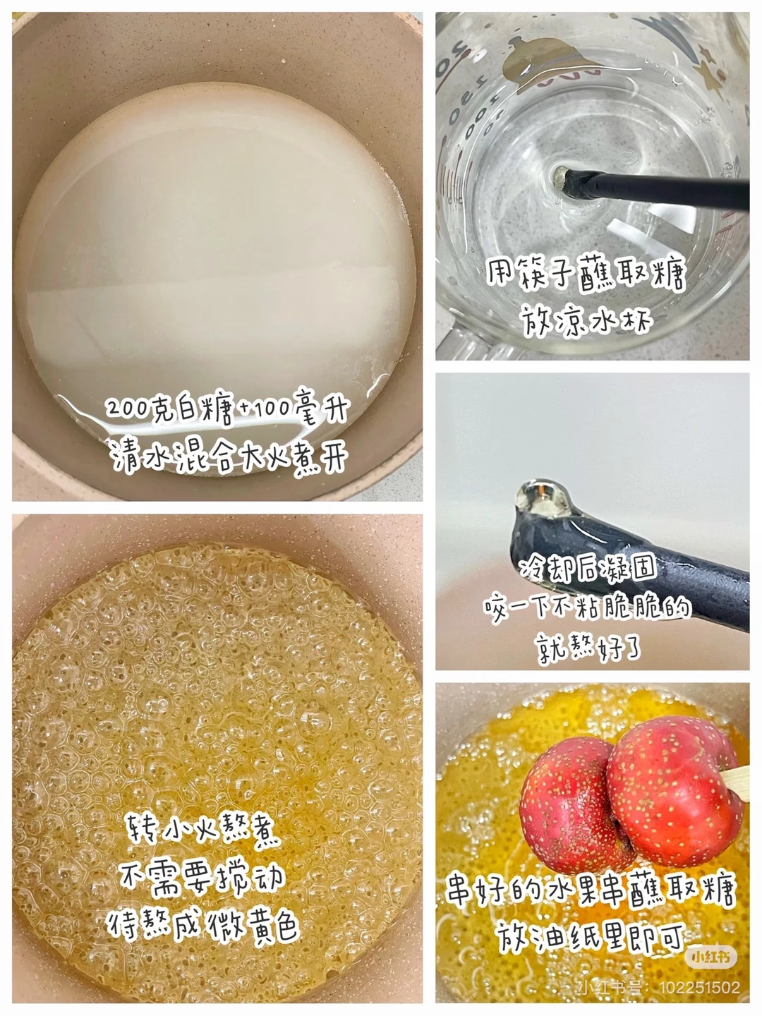 🔹煮开后转小火 (❗️注意不要搅拌) 由大泡慢慢变成小泡接着会变成微黄色,这时可以拿一根筷子蘸取糖放进凉水里,取出后糖凝固,且咬下去脆脆的不粘牙,就说明糖熬好了,如果粘牙则需要继续熬一下。